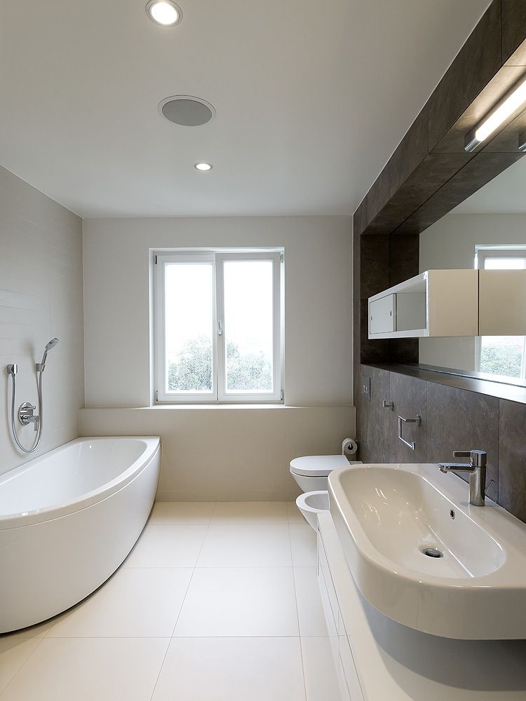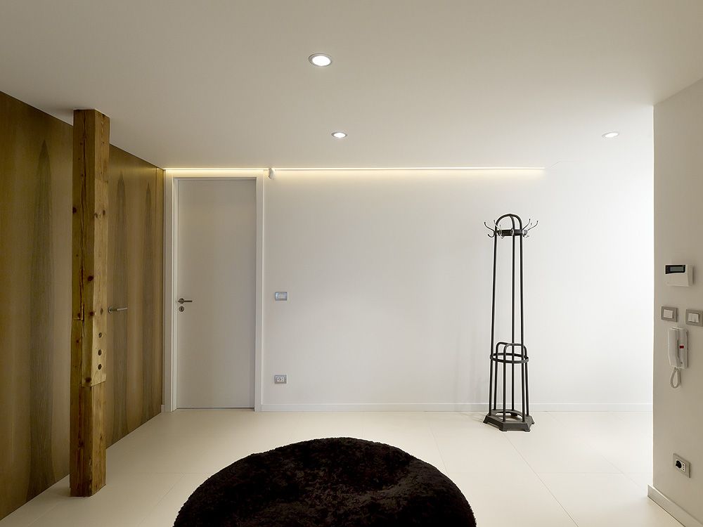 Spoločenský denný priestor bytu má jednotlivé obytné časti vzájomne prepojené, v nočnej zóne sú miestnosti, naopak, oddelené a viac v ústraní, aby poskytovali dostatok súkromia. V kontraste k nim sú v ústraní oddelené priestory súkromné. Hlavná obývacia miestnosť, ktorá je centrom dispozície, sa vyznačuje najvyšším stropom. Táto časť bytu sa dá vnímať z rôznych uhlov pohľadu. Pohľad smerom ku kozubu charakterizuje sivá stierka ukončená v úrovni podlahy horného podlažia. Vrchná hrana tejto plochy horizontálne rozpoľuje priestor v jeho najväčšej výške. Je to jednoduchý spôsob, ako zariadiť, aby sa strop javil ako nižší a obývacia izba pôsobila útulnejšie.