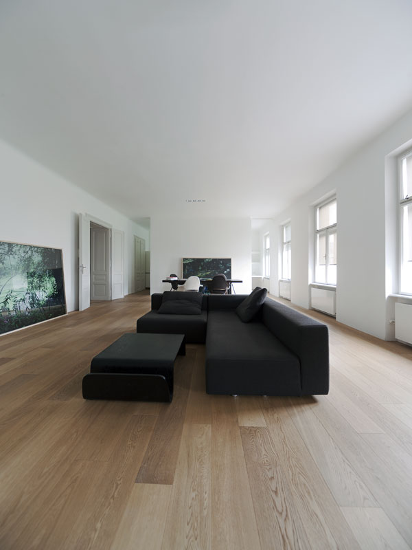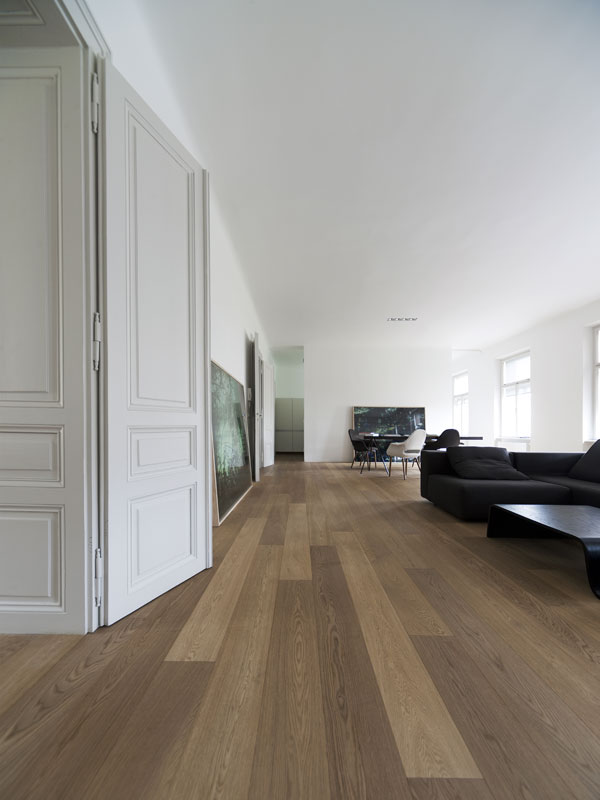 Zjednocujúcim prvokom je dubové drevo, ktoré je aplikované na podlahe a odkladacích priestoroch pod vyvýšenými pódiami a biela farba aplikovaná na drevených elementoch a stenách bytu