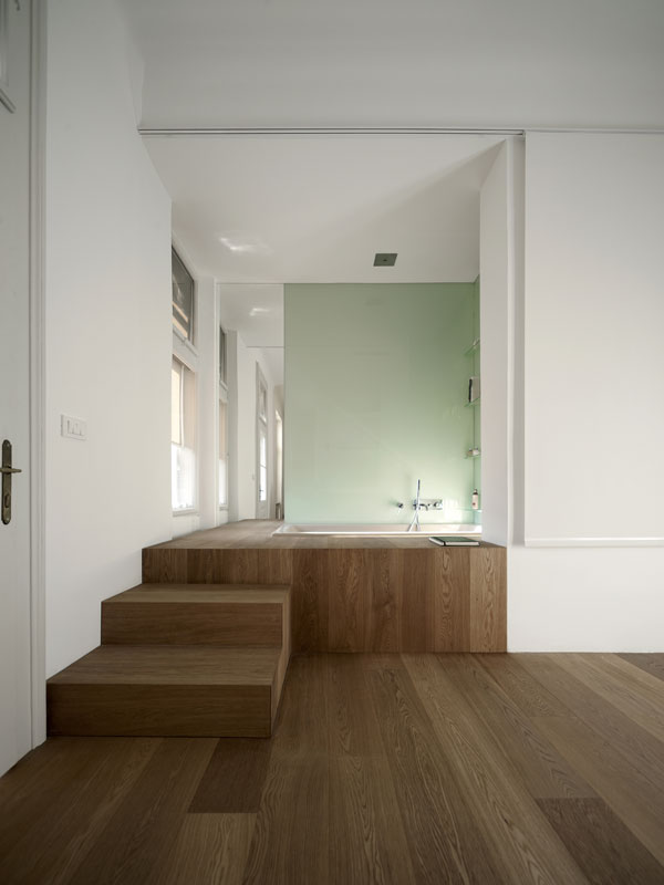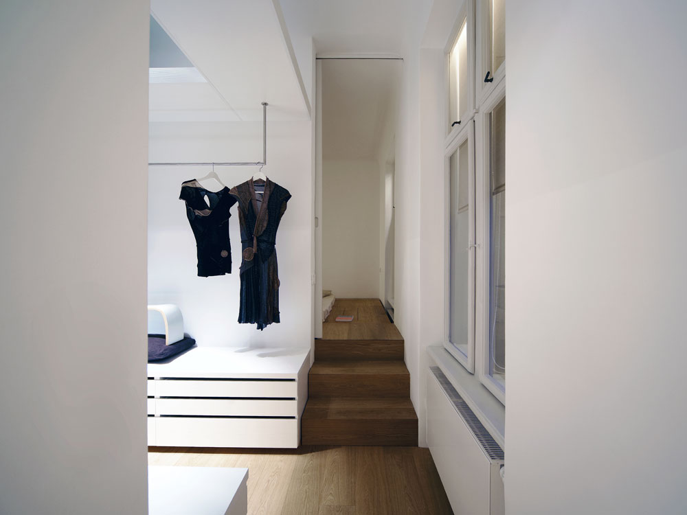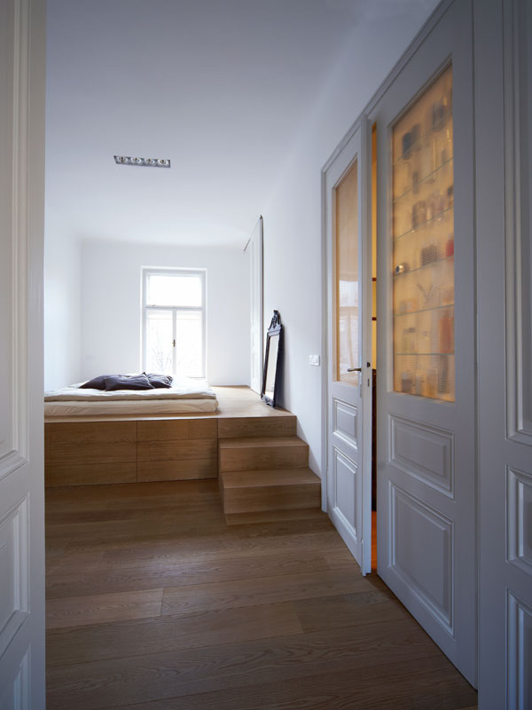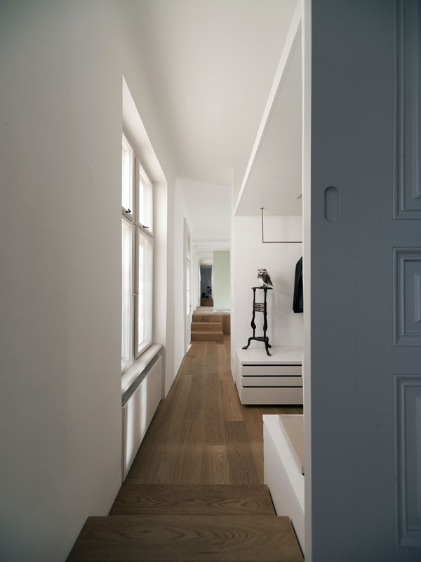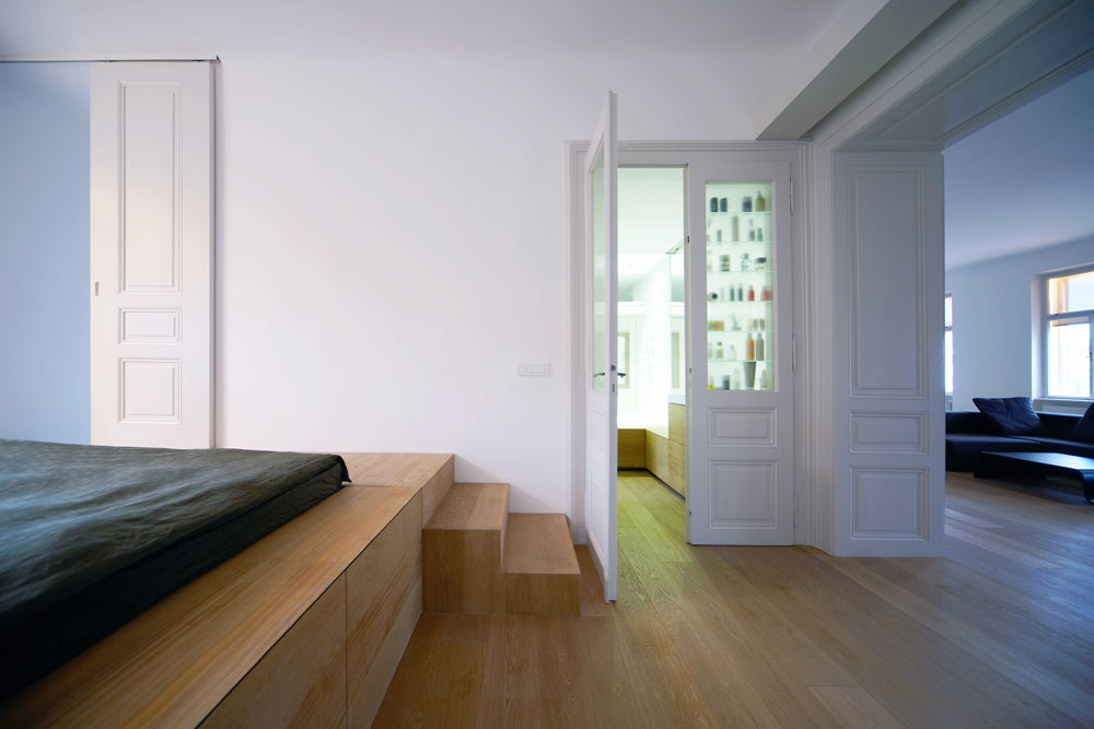 Tím architektonického štúdia Ofis Arhitekti sa rozhodol pre otvorenie priestoru, pričom kládol dôraz na zachovanie jednoznačného definovania priestorov.Projekt charakterizuje otvorená dispozícia definovaná rozličnými výškovými hladinami jednotlivých miestností. Rozličné výškové členenie prispelo k plynulému prepojeniu jednotlivých miestností v byte. Priestor, ktorý vznikol pod zvýšenými podlahami poskytuje dostatok miesta na odkladanie najrozličnejších predmetov. Nábytok je integrovaný do elementov podlahy. Zvýšené podlahy zároveň definujú hranice miestností.