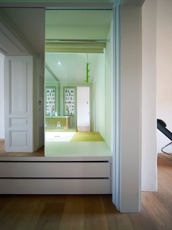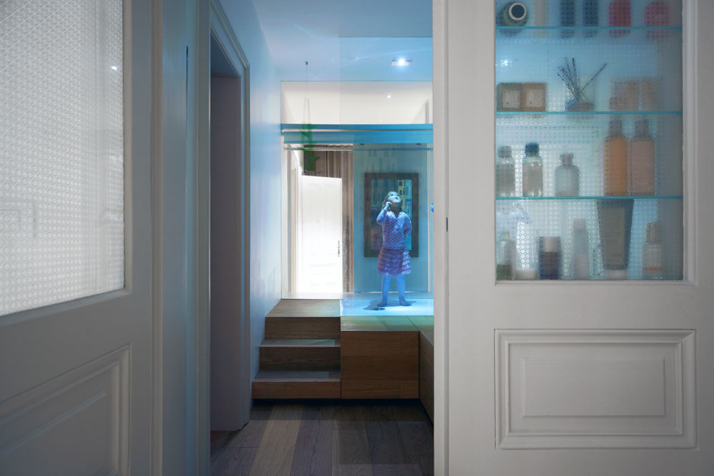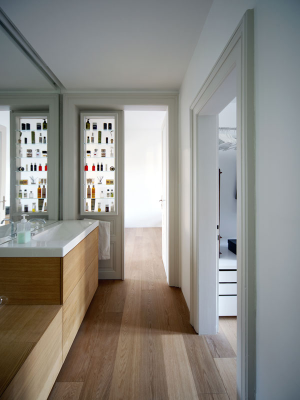 Zaujímavý detail vznikol využitím zasklených dverí, kozmetické výrobky uložené na sklených policiach inštalovaných na zasklených dverách pôsobia veľmi efektne