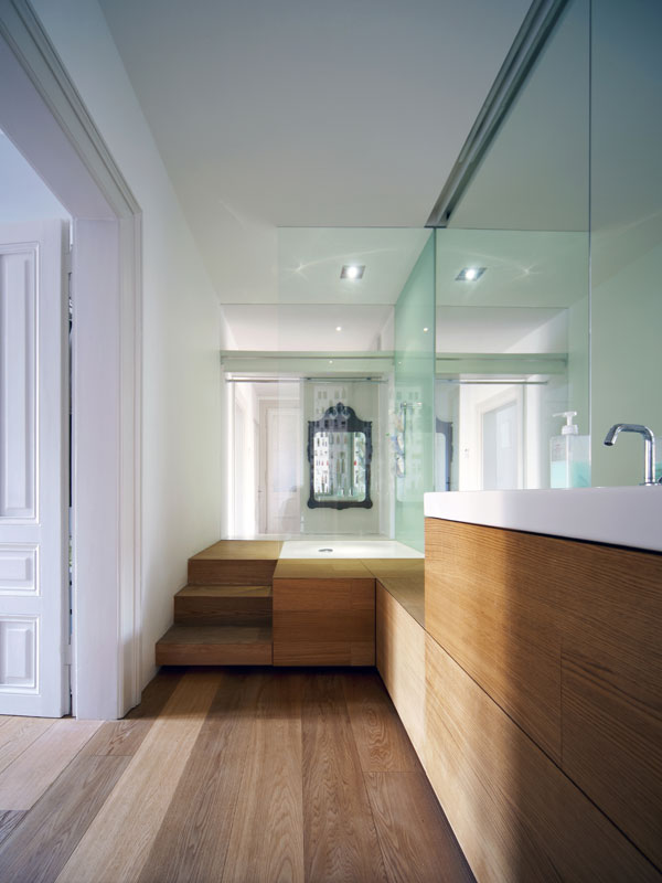 V kúpeľni dominuje biela keramika a drevo, sprchovací kút kopíruje výškovú líniu spálne a tak ako v prípade matracu aj sprchovacia vanička sa stala súčasťou podlahy