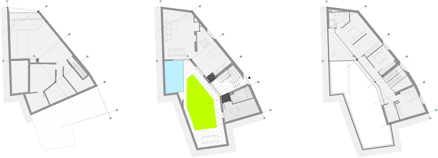 Toto vynútené usporiadanie zároveň úplne ladí s potrebami staviteľov – súkromie je zo strany ulice dokonale odtienené a, naopak, do priestoru súkromného zeleného átria s bazénom otvorené, čím poskytuje interiérom dostatok svetla.