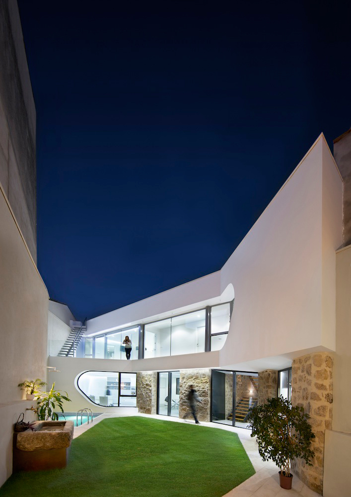 Vnútro domu je vytvorené druhým prvkom, konštrukciou vloženou do kamenných základov historického domu. Nová konštrukcia svojím zahnutím vytvára priestor na príjemné vnútorné nádvorie s bazénom. Pohľad z nádvoria akoby patril k úplne inému domu. Zaujímavý efekt dosiahli architekti vkomponovaním oblých tvarov do bieleho moderného celku, tvoriaceho druhý prvok domu.
