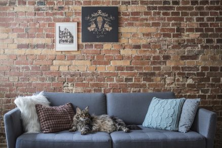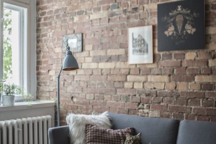 Celý priestor neveľkého štúdia zútulňuje drevo, kožušinky a dekoračné tkaniny. Na hlavnej stene miestnosti je omietka oškriabaná až na tehly, čo dáva priestoru špecifický ráz. Históriu pripomínajú aj detaily – malá čierna komoda v historickom štýle, obrazy a fotografie na stenách, tabuľkové okno.