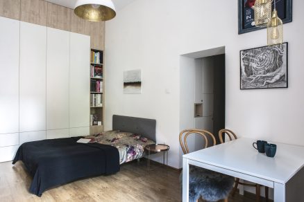 Priznávajú, že radi navrhujú priestory v starých bytoch pre ich jedinečnú atmosféru. Dôležitú rolu hrajú vysoké stropy a murované steny. Keďže priestor štúdia je obmedzený, úlohou architektov bolo rozdeliť ho na niekoľko funkčne odlišných zón. Majiteľ požadoval, aby štúdio zahŕňalo kuchyňu, spálňu, obývačku a pracovňu. Nesmel chýbať ani šatník.