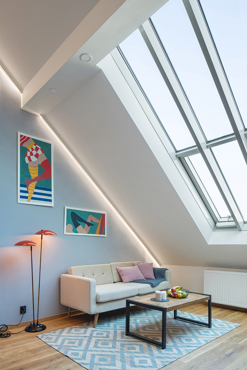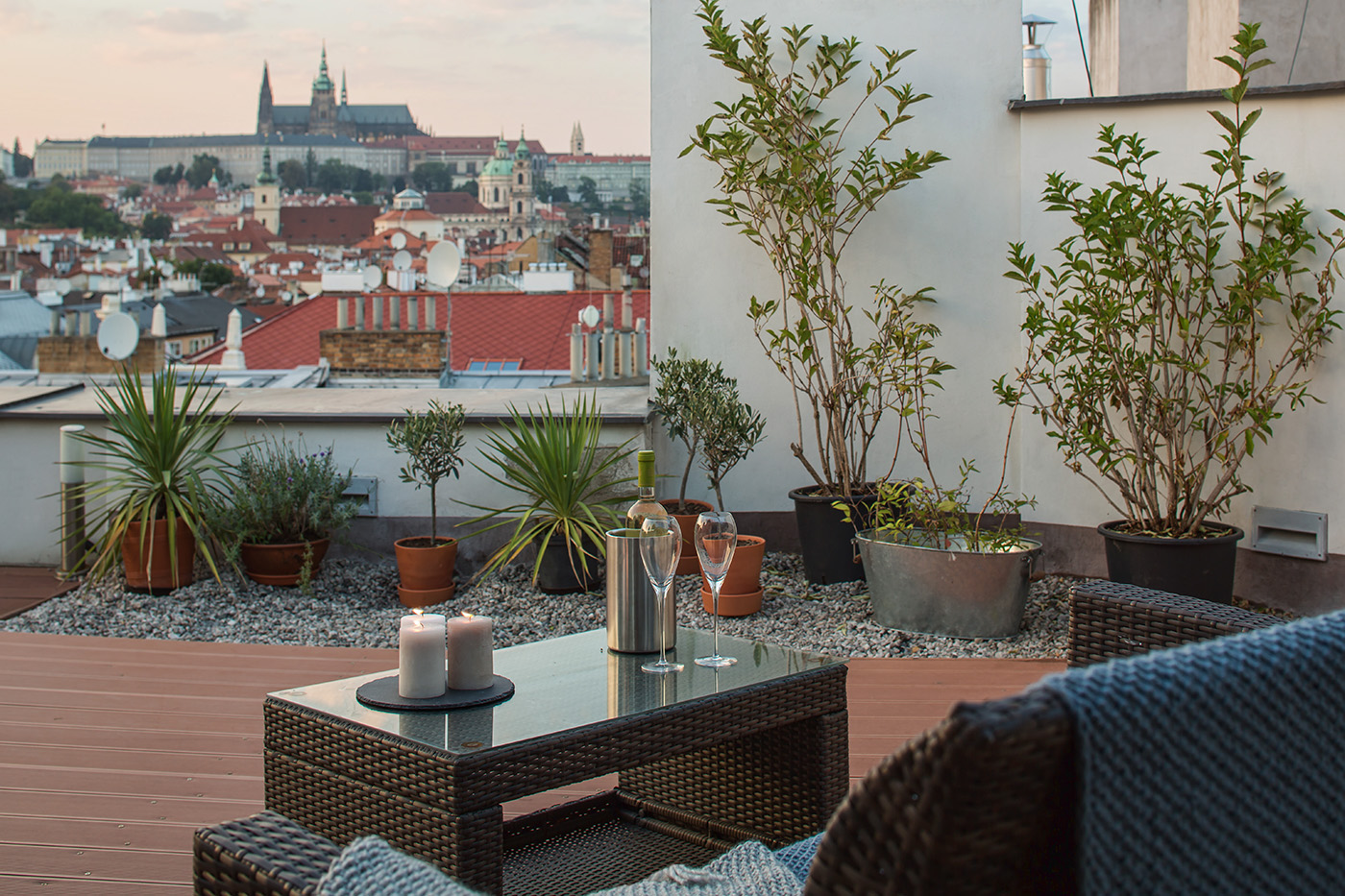 Zoborovská ulica v Prahe je charakteristická secesnými stavbami. V podkroví jednej z nich sa nachádza neveľký byt, ktorý prešiel rekonštrukciou architektky Ivany Šustrovej. Vznikol príjemný harmonický priestor s točitým schodiskom a fascinujúcim výhľadom z terasy, ktorá nadväzuje na spálňu.