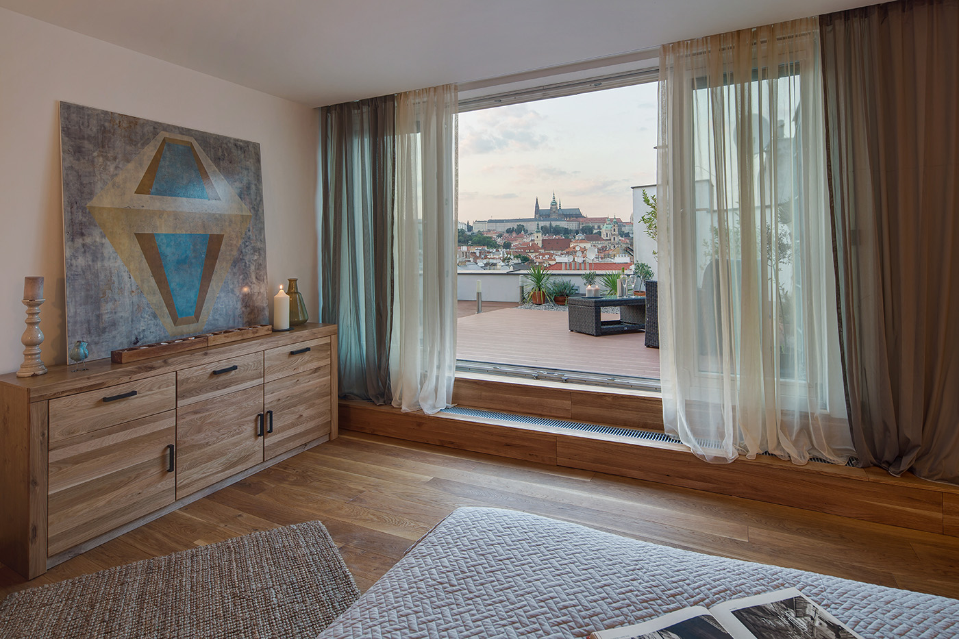 V rovnakej farebnosti sú riešené aj závesy. Ak ich odostriete, naskytne sa vám skrz terasu výnimočný pohľad na stovežatú. Vyjdete na terasu a máte Hradčany a Petřín ako na dlani.
