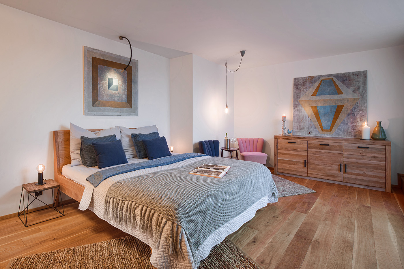 Atmosféru okrem čierneho kovového točitého schodiska vytvára stena plná moderných pestrofarebných obrazov, ktorá má sivomodrú maľovku. Hru sivej a modrej nájdeme aj na obraze od Martina Feriho v spálni, kde dominuje drevo a jeho hnedá farba.
