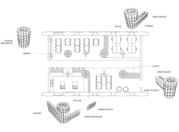 Tvorivé laboratórium a reštaurácia NOMA sa nachádza v bývalom sklade, ktorý bol zapísaný do národného registra chránených budov. To znamenalo, že architekti museli navrhnúť interiér bez použitia jediného klinca do steny či podlahy. Cieľom bolo navrhnúť štyri centrálne multifunkčné skladovacie jednotky, každú zloženú z vyše päťsto drevených kociek. Ich zakrivenie hravo rozdelilo priestor do menších častí, kde sa nachádza napríklad malá bylinková záhrada, priestory pre personál a kancelárie.