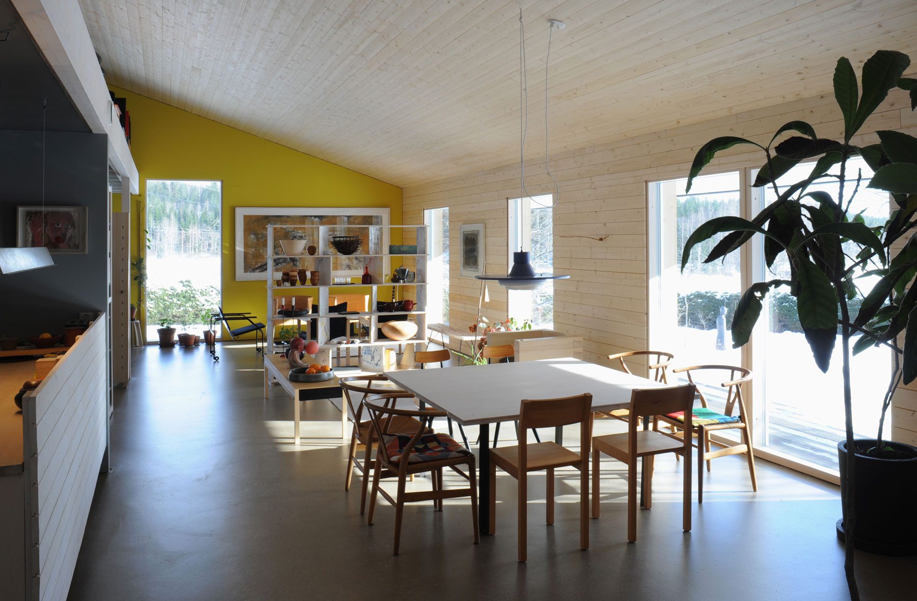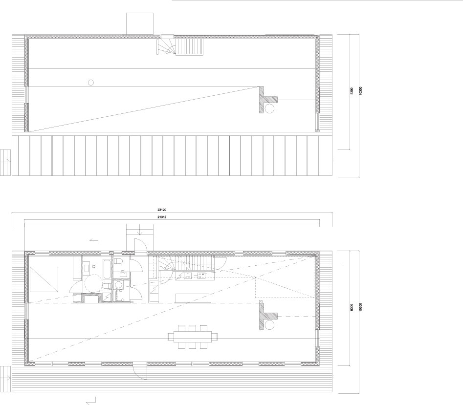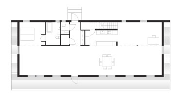 Denná a pracovná zóna sa nachádzajú na jednej úrovni. Uzavreté izby sú situovaných vo vstupnej časti pod galériou, zatiaľ čo časť orientovaná na jazero je úplne otvorená. Majitelia si želali priestor maximálne otvoriť, aby získal postupne svoj účel a neskôr ho bolo možné podľa potreby príslušne rozdeliť. Dom je vykurovaný geotermálnou energiou a vzhľadom na tepelnoizolačné vlastnosti ide o nízkoenergetický dom.