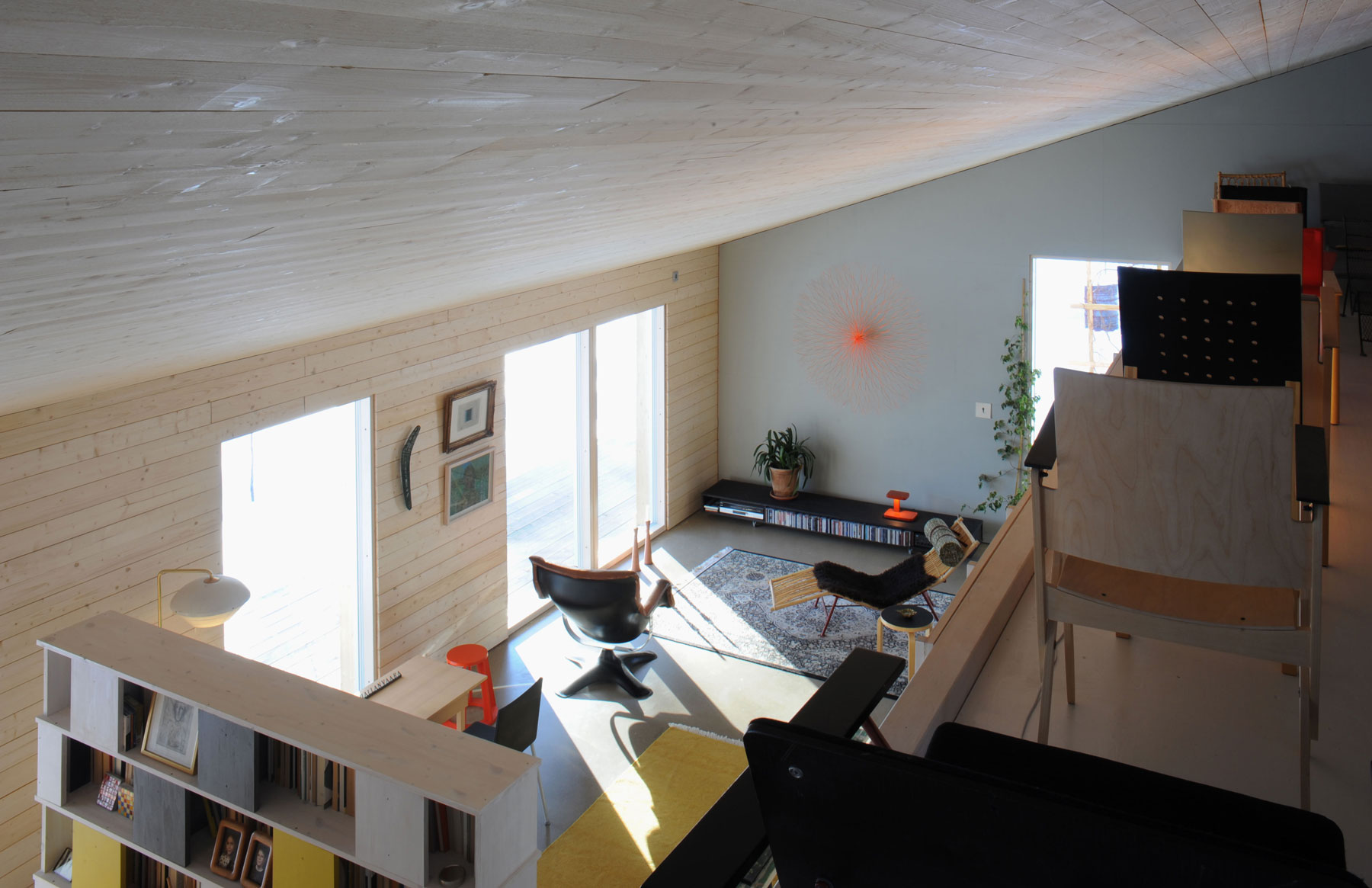 Ďalšou podmienkou projektu bolo zároveň vytvoriť veľký skladovací priestor na prototypy nábytku, ktorý dizajnér nahromadil počas mnohých rokov. Na tento účel manželský pár potreboval polovične otvorený priestor vo vnútri domu. Riešením bolo vybudovanie mezanínovej galérie nad dennou zónou.