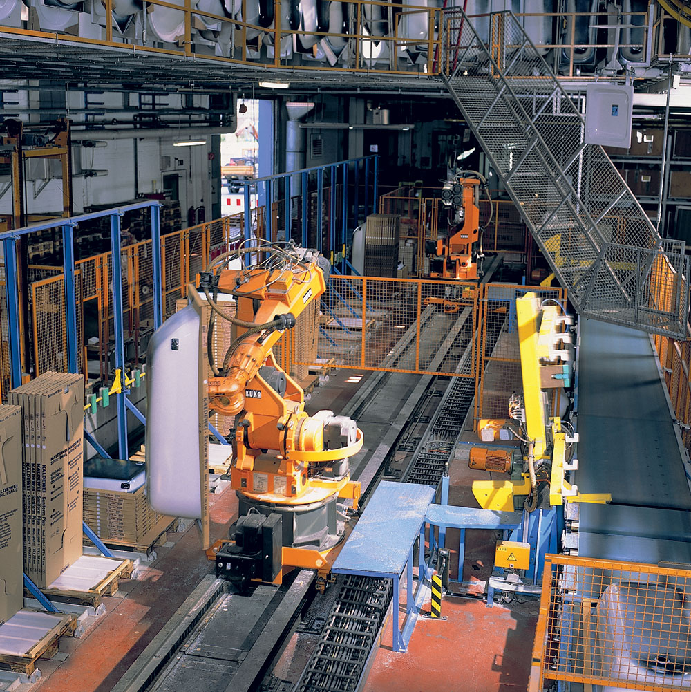 Veľká časť výroby je plne automatizovaná – výsledkom pôsobivého baletu robotických ramien je jeden oceľový výlisok sprchovacej vaničky alebo oceľovej vane každých 12 sekúnd.