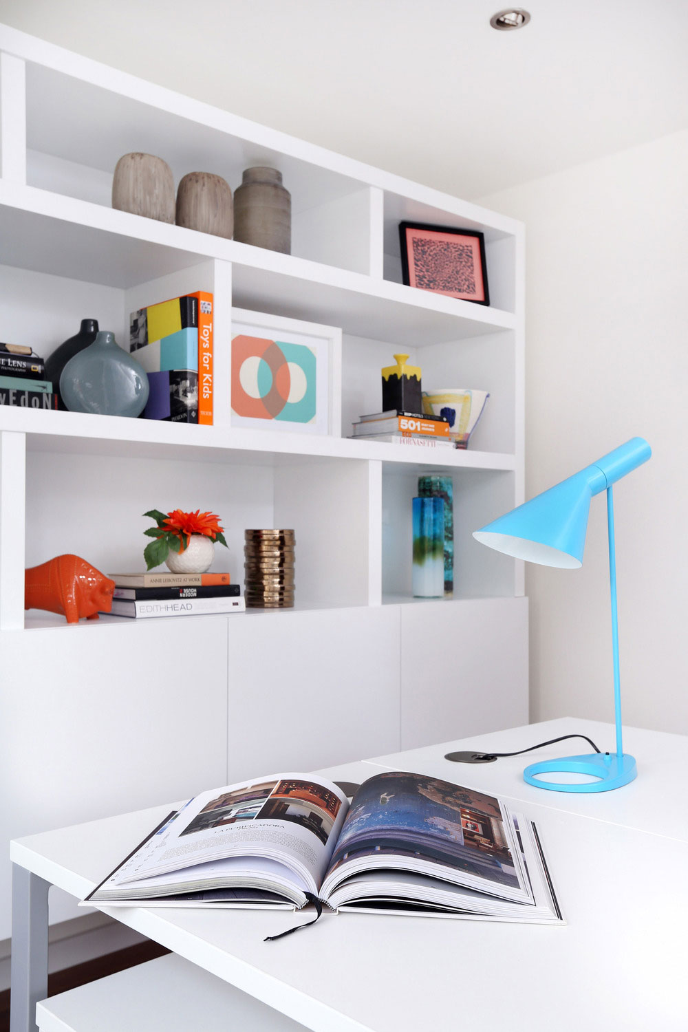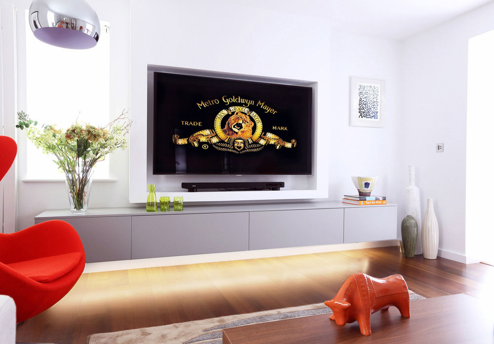 Veľká a pohodlná sedačka v tvare L spolu s dizajnovým oranžovým kreslom od Arneho Jacobsena vytvárajú pohodovú atmosféru, ktorú dotvára koberec a umelecké diela. Na objednávku zhotovený lakovaný závesný panel vytvára priestor na 65″ TV, ktorá však napriek veľkosti nedominuje priestoru.