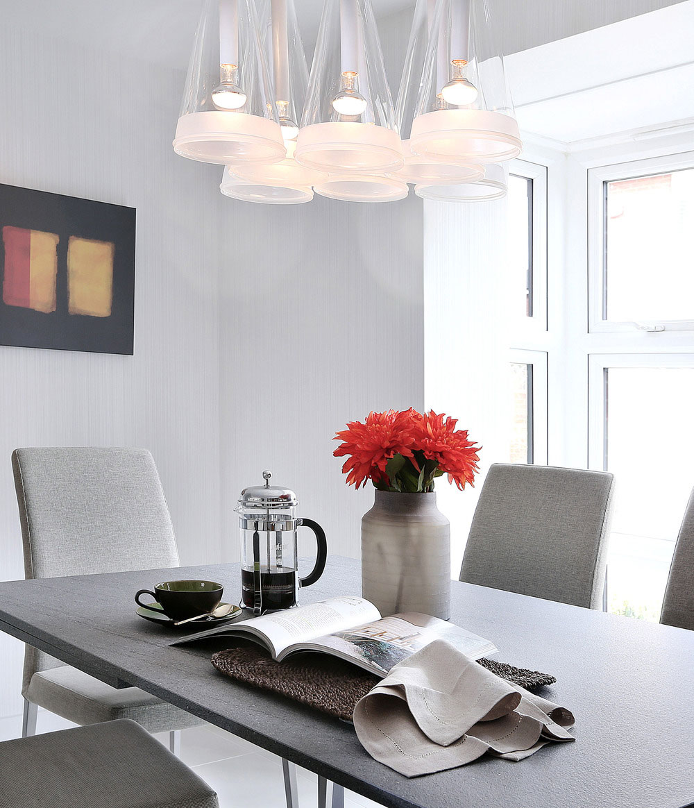V jedálni nachádzame opäť dizajnovú chuťovku Flos spun, ktorá nádherne rozžiarila decentný interiér, ktorý vytvorila kombinácia granitového jedálenského stola a čalúnených stoličiek neutrálnych sivých odtieňov.