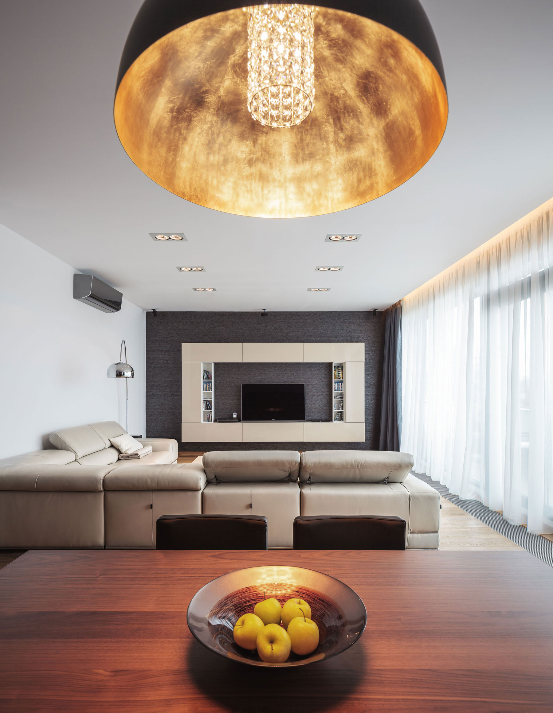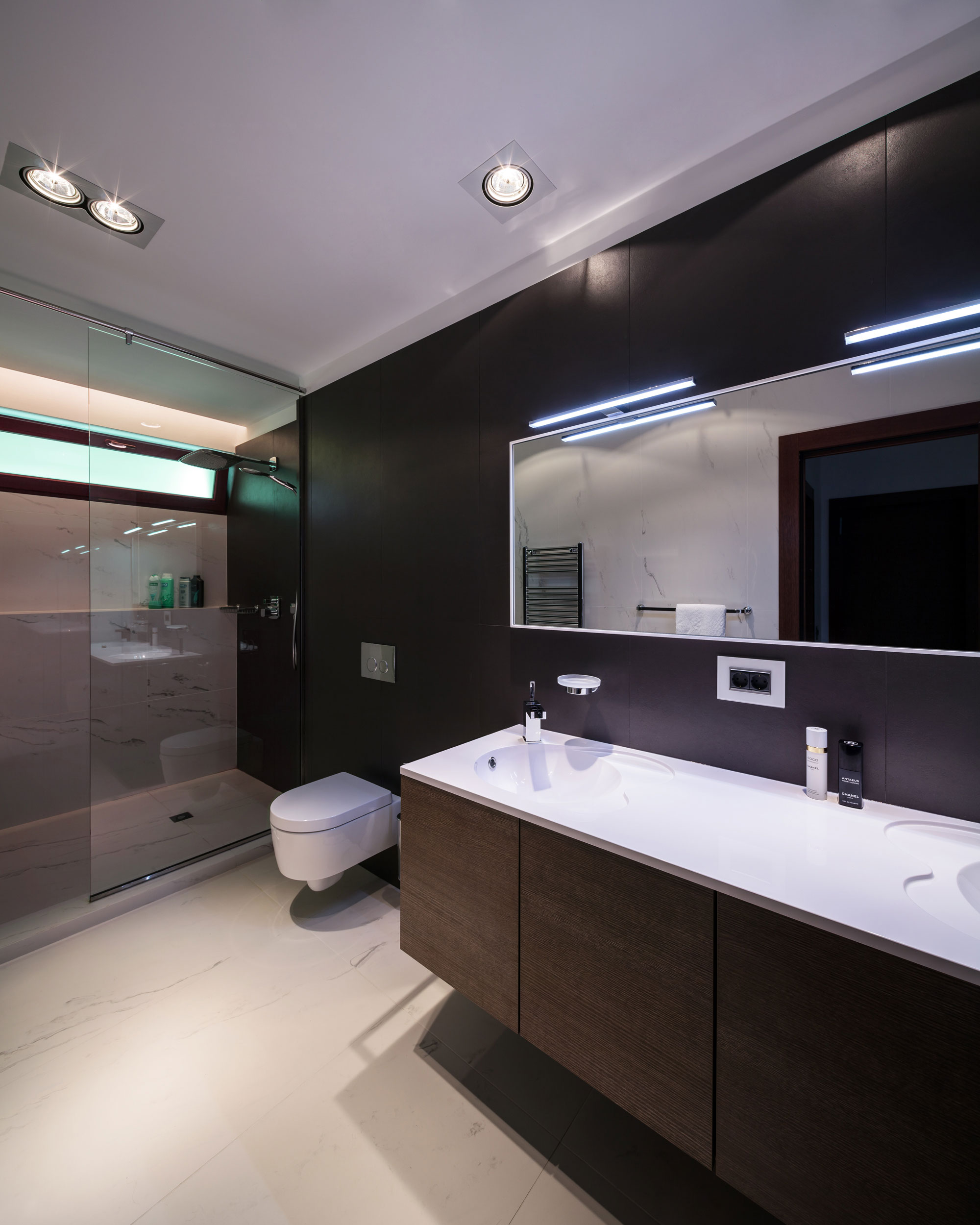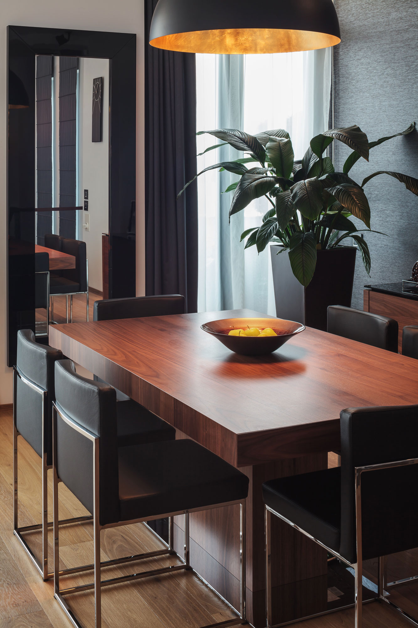 Cieľom architektov a dizajnéra bolo po dohode s klientom vytvoriť interiér, ktorý by vynikal elegantným, sofistikovaným zjavom a zároveň prinášal obyvateľom pocit útulného a prívetivého domova. Aby sa tímu profesionálov podarilo splniť všetky požiadavky, rozhodol sa pre využitie špecifických materiálov a farebných schém. Autori priestoru sa zamerali na nábytok s vysokým leskom, najmä v obývacej časti a kuchyni, v kombinácii s textúrou surového dreva a tlmenou farebnou schémou zloženou z čiernej, bielej, prírodných béžových, hnedých, pieskových či sivých odtieňov. Chrómové prvky a efektné osvetlenie boli čerešničkou na torte perfektne zvládnutého dizajnu.
