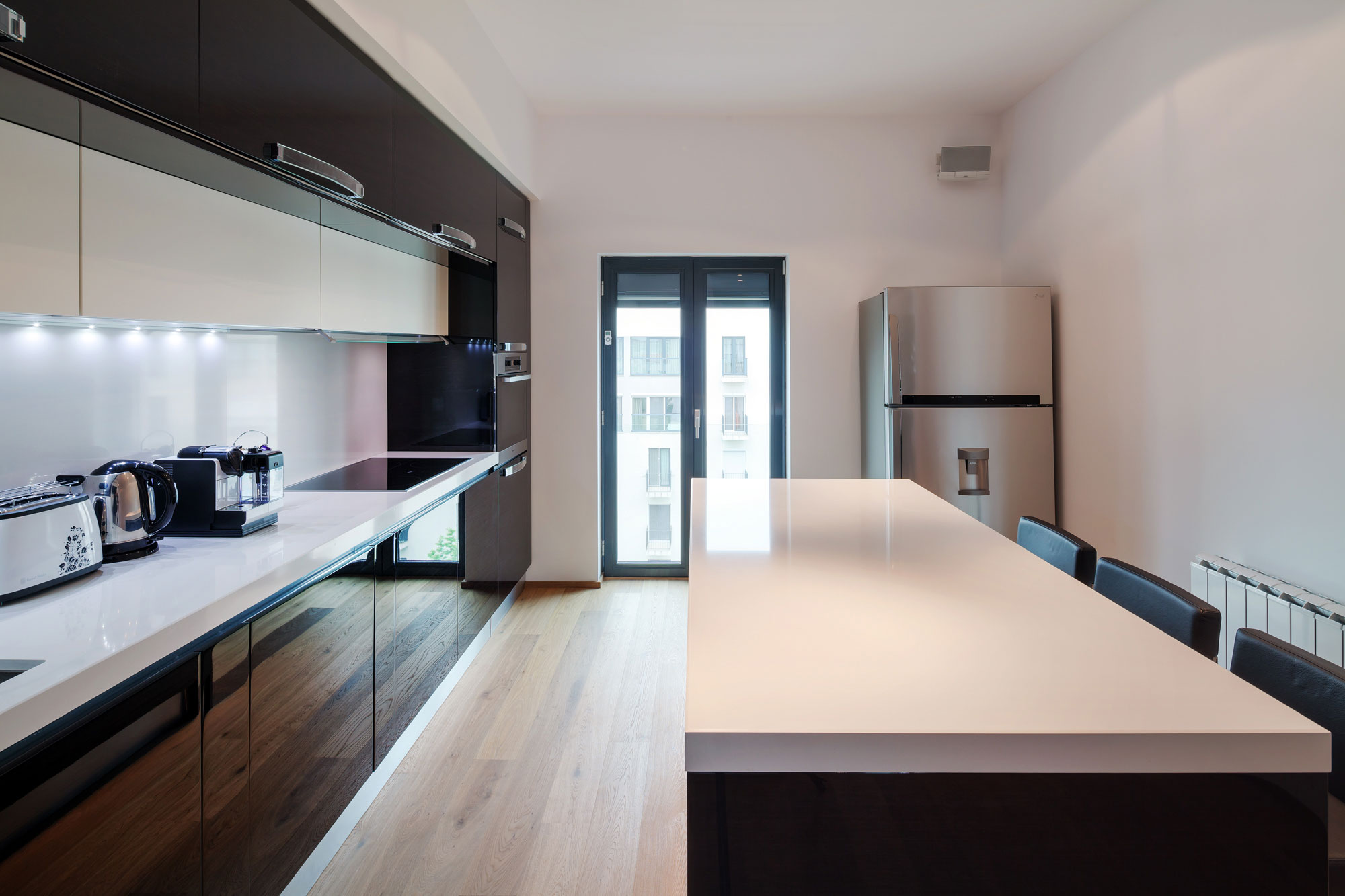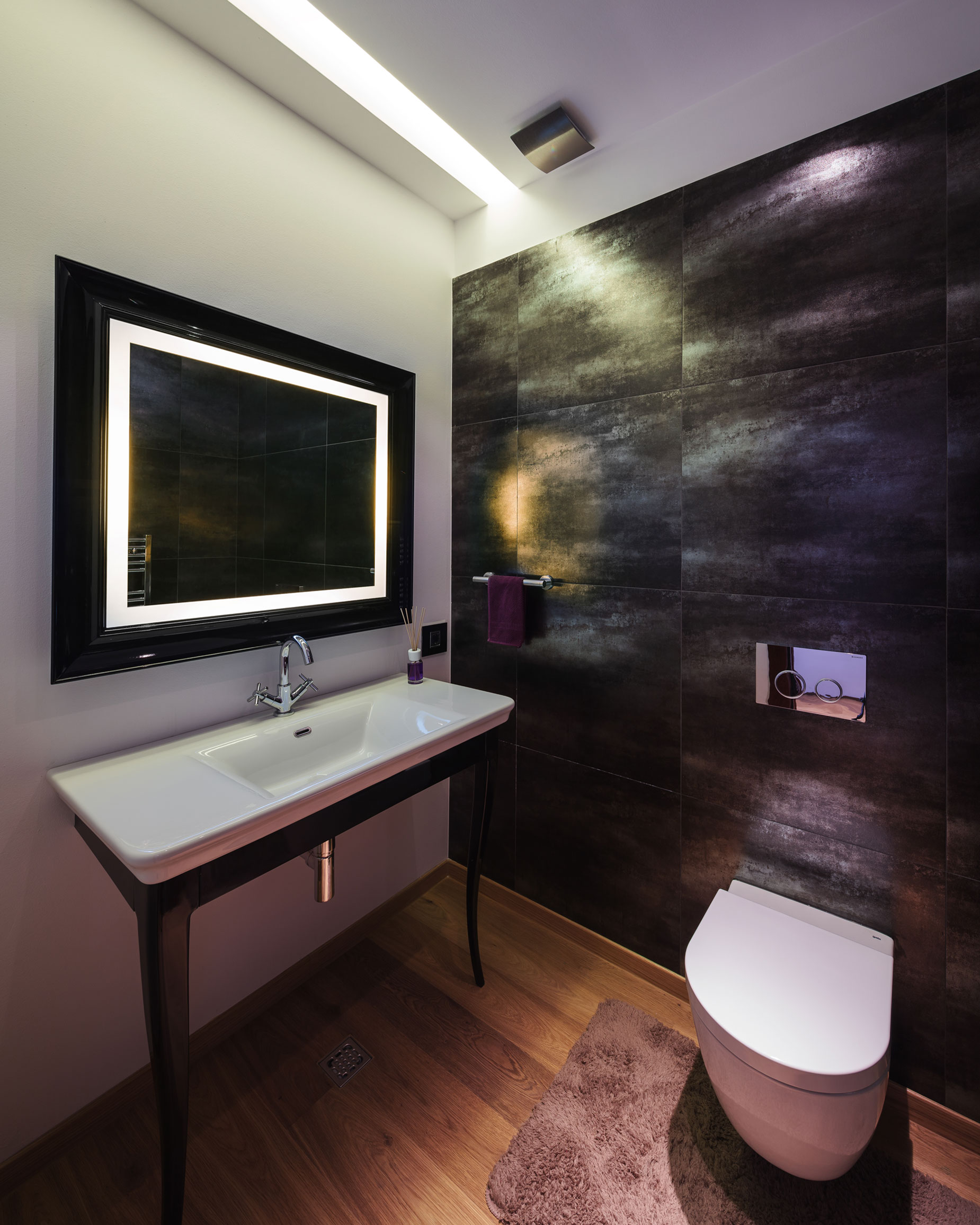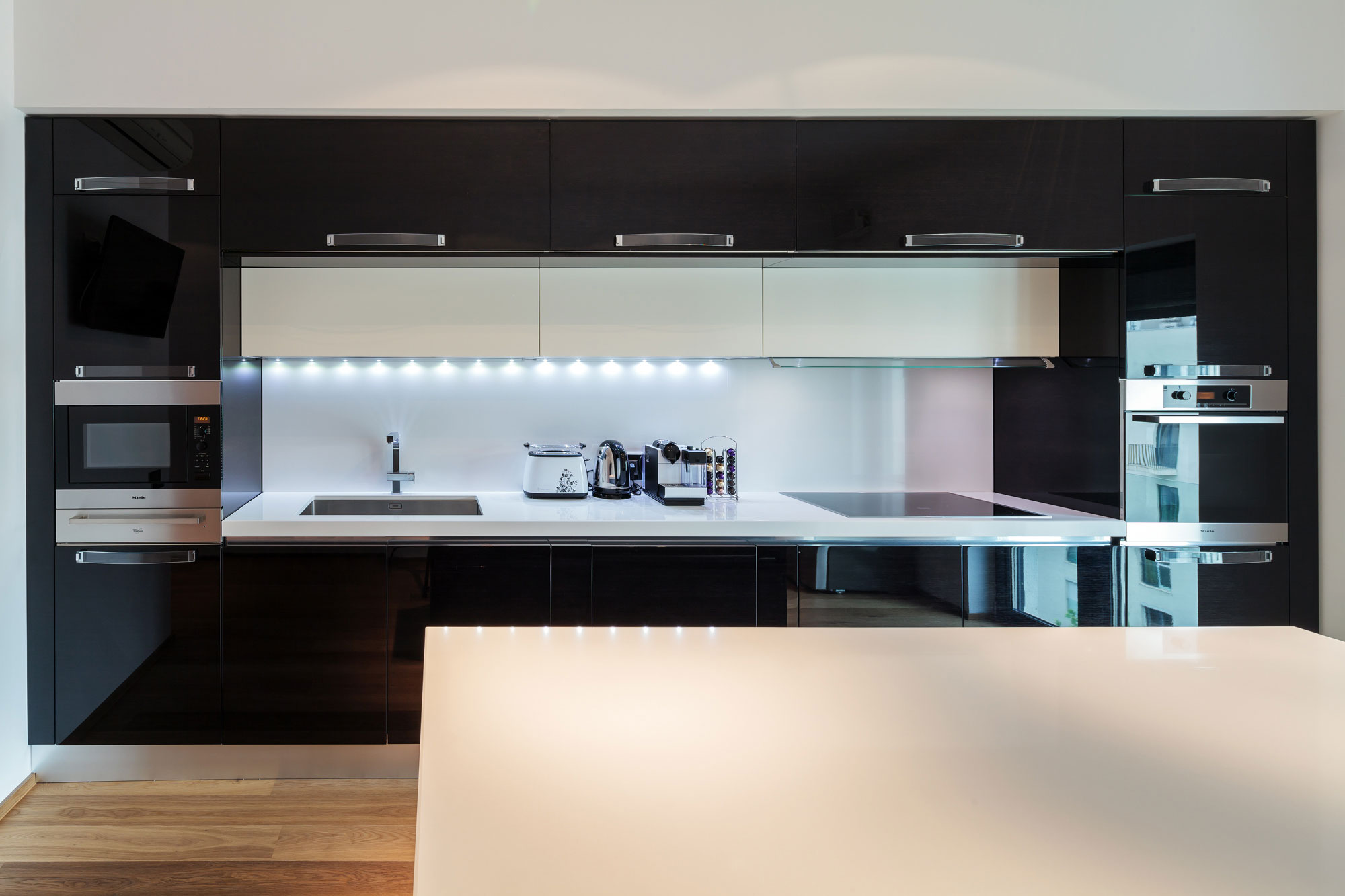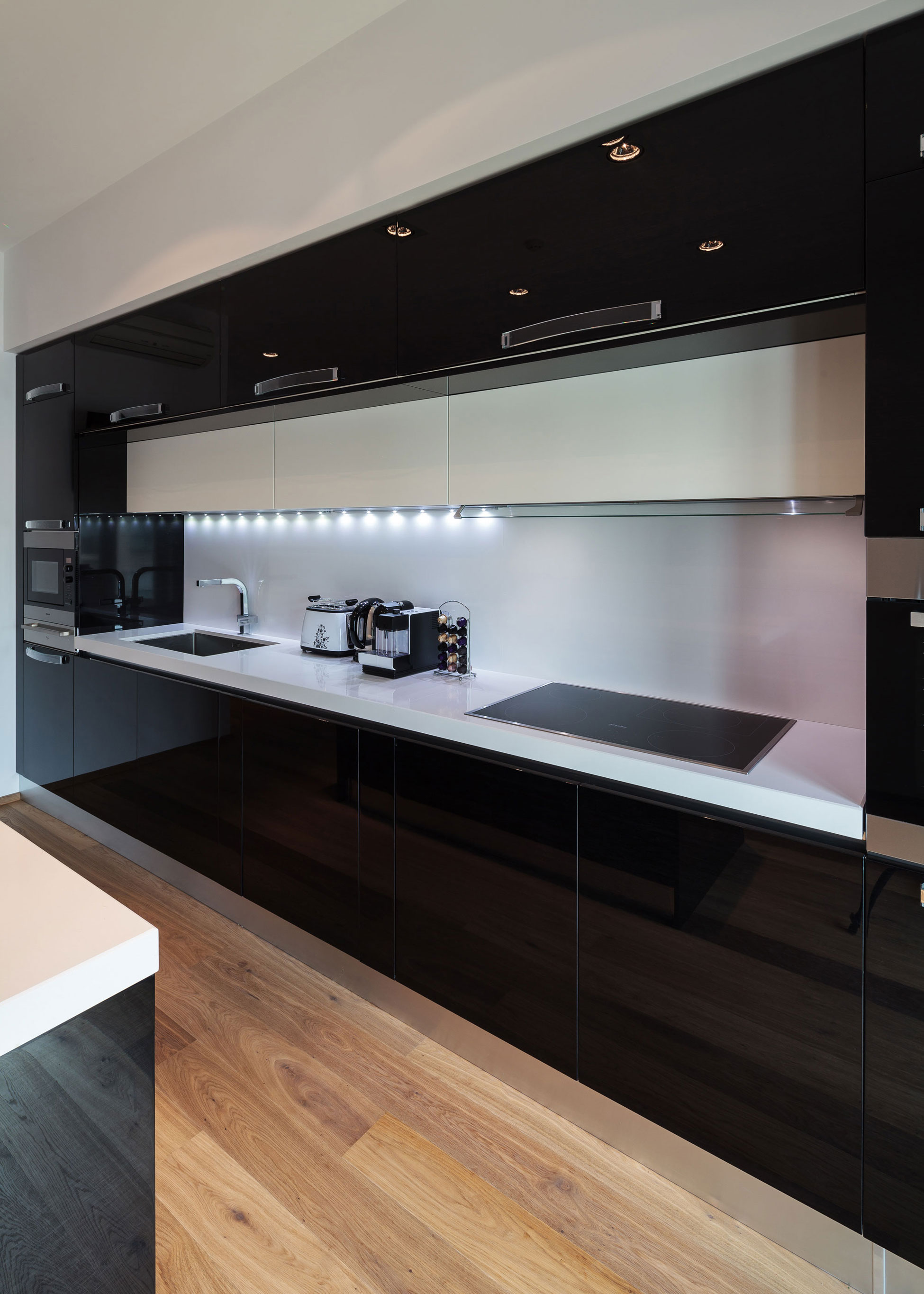 Čierno-bielu kuchyňu – taktiež vo vysokom lesku – dopĺňa opäť drevená podlaha. Chrómové detaily ladia s veľkou chladničkou a aj ten najmenší detail je plynulo zasadený do celkového vizuálu – všimnite si napríklad malé kuchynské spotrebiče. Ešte aj tie perfektne ladia s čierno-bielou schémou kuchyne. Celkový dojem podčiarkuje LED pásové osvetlenie umiestnené pod vrchnou časťou kuchynskej linky. Spálne a kúpeľne sú ladené podobne – opäť v nich dominuje kombinácia čiernej, bielej, sivých odtieňov, kameňa a dreva – a zavŕšené sú vhodným osvetlením.