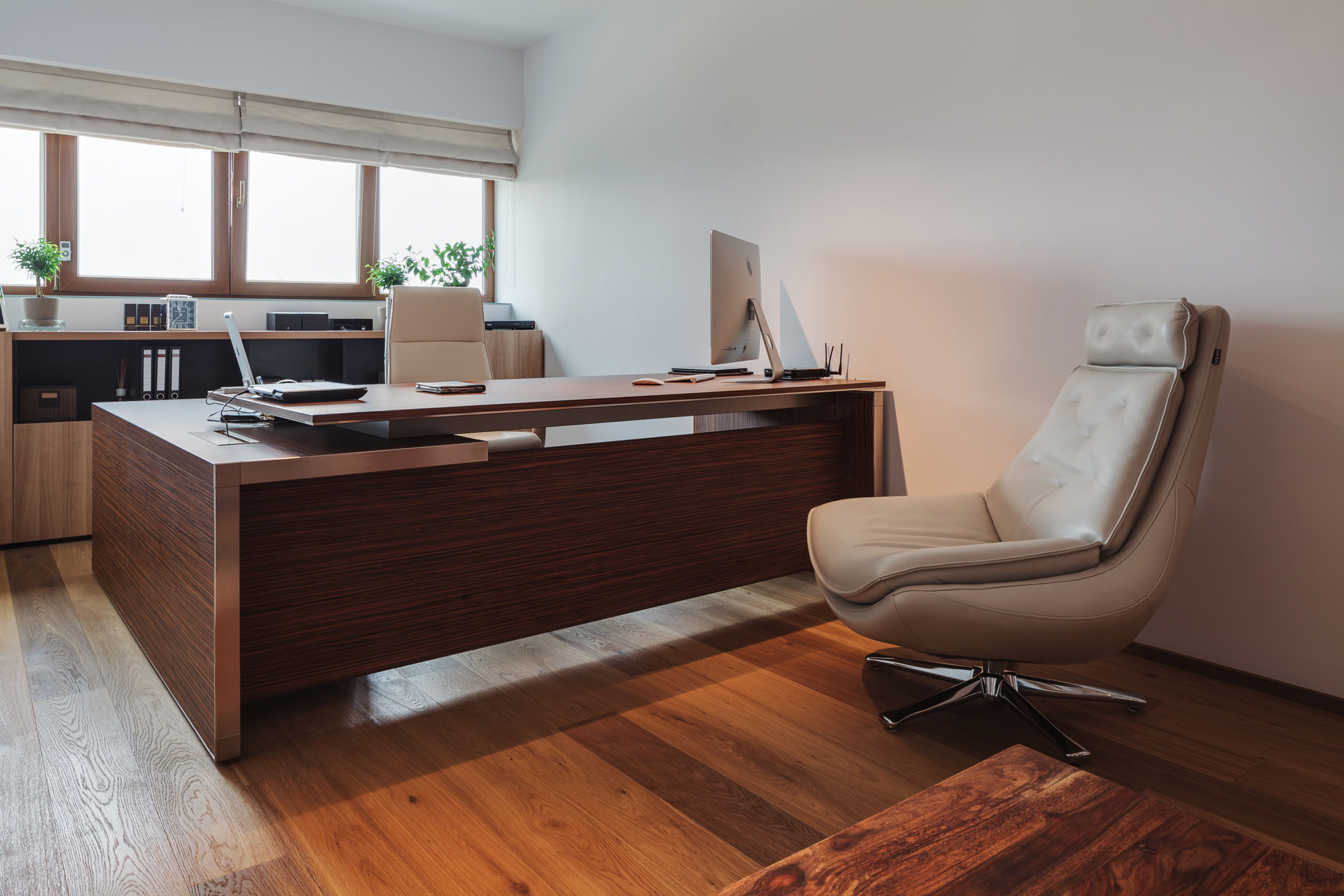 Jediná miestnosť, ktorá pôsobí trošku odlišne od zvyšku bytu, je pracovňa, v ktorej prevláda drevo. Aj tu je však masívne drevo doplnené kovovými prvkami, čiernou textilnou sedačkou a pohodlnými kreslami z bielej kože.