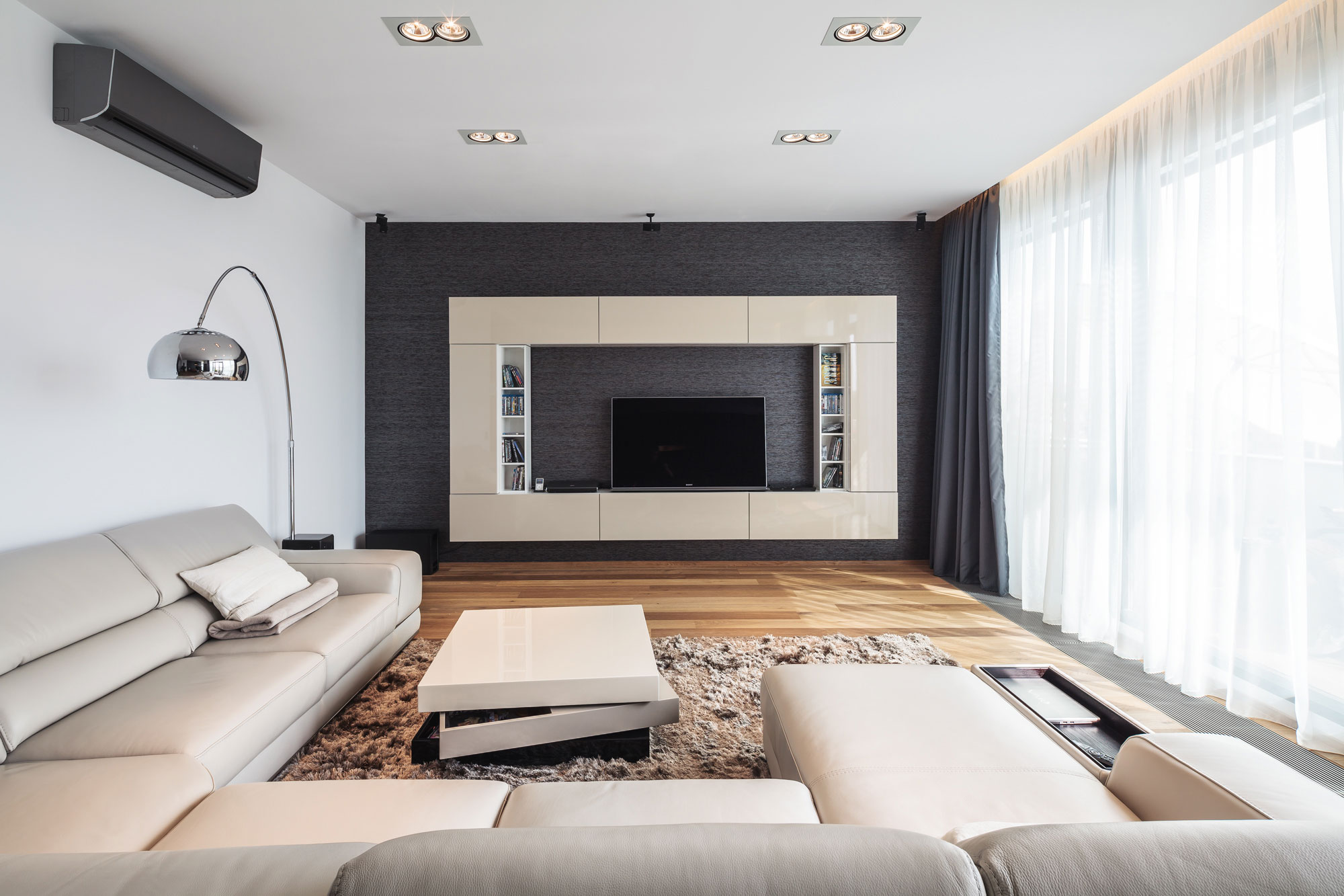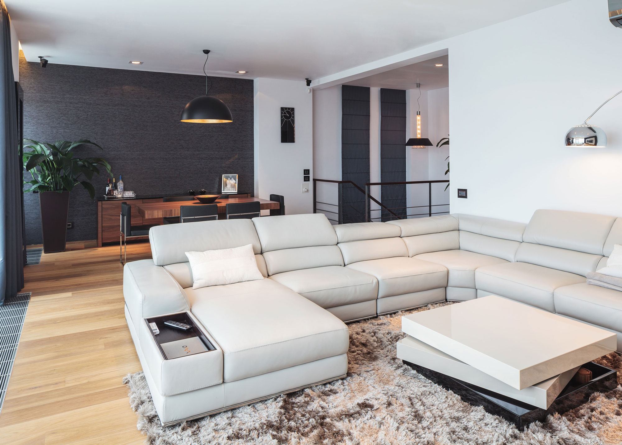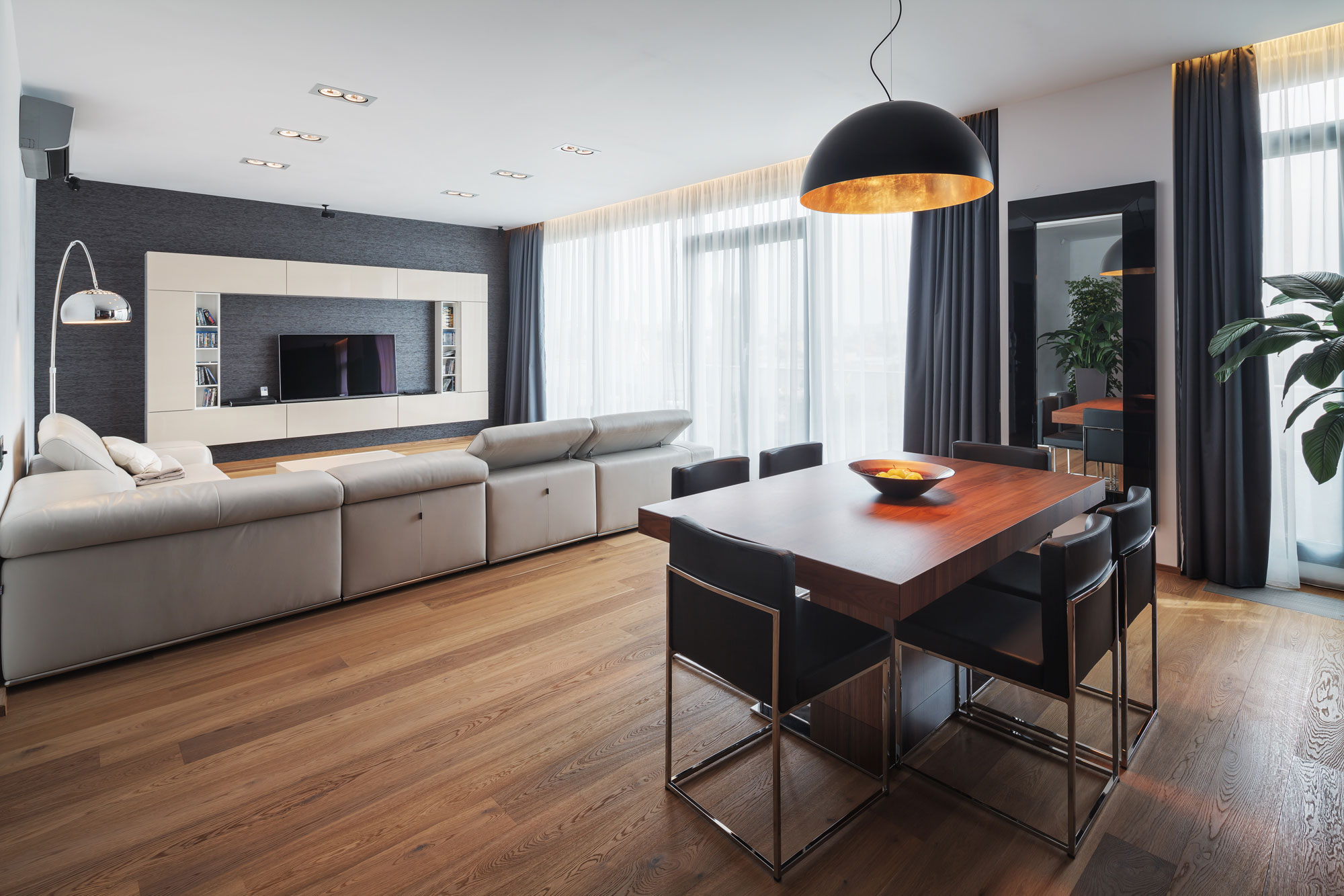 Jednoduché a efektívne riešenia nájdeme v každej miestnosti. V obývacej izbe spojenej s jedálňou je to kombinácia tmavosivej textúrovanej tapety nachádzajúcej sa na dvoch protiľahlých stenách s krémovou nábytkovou stenou s vysokým leskom, ktorá korešponduje s veľkou pohodlnou sedačkou a konferenčným stolíkom. Jedálenský stôl a komoda z dreva vhodne dopĺňajú elegantnú farebnú schému a zároveň ladia s podlahou, ktorá je taktiež vyhotovená z dreva, avšak v inom, bledšom odtieni.