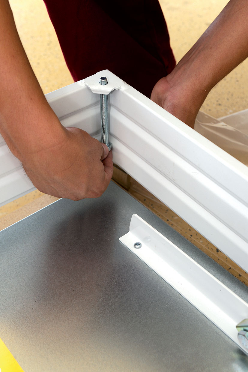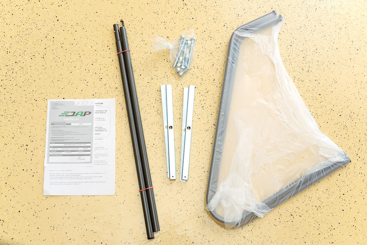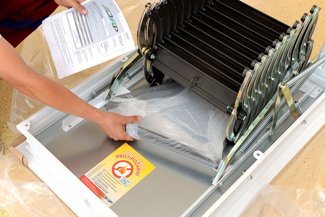 Na veku je páskou prilepené vrecúško so štyrmi skrutkami M10 × 100 mm, maticami na uchytenie rámu schodov do stavebného otvoru a dvoma skrutkami 10 × 25 mm na inštaláciu na veko. Zároveň sa vo vrecúšku nachádza rozložený zámok. Zámok sa vmontuje do veka a následne sa veko zaklapne do rámu. Vo vnútri schodov sú uložené: balíček so štyrmi nosníkmi určenými na zavesenie rámu do otvoru, jeden pár zábradlia a jedna sťahovacia tyč.