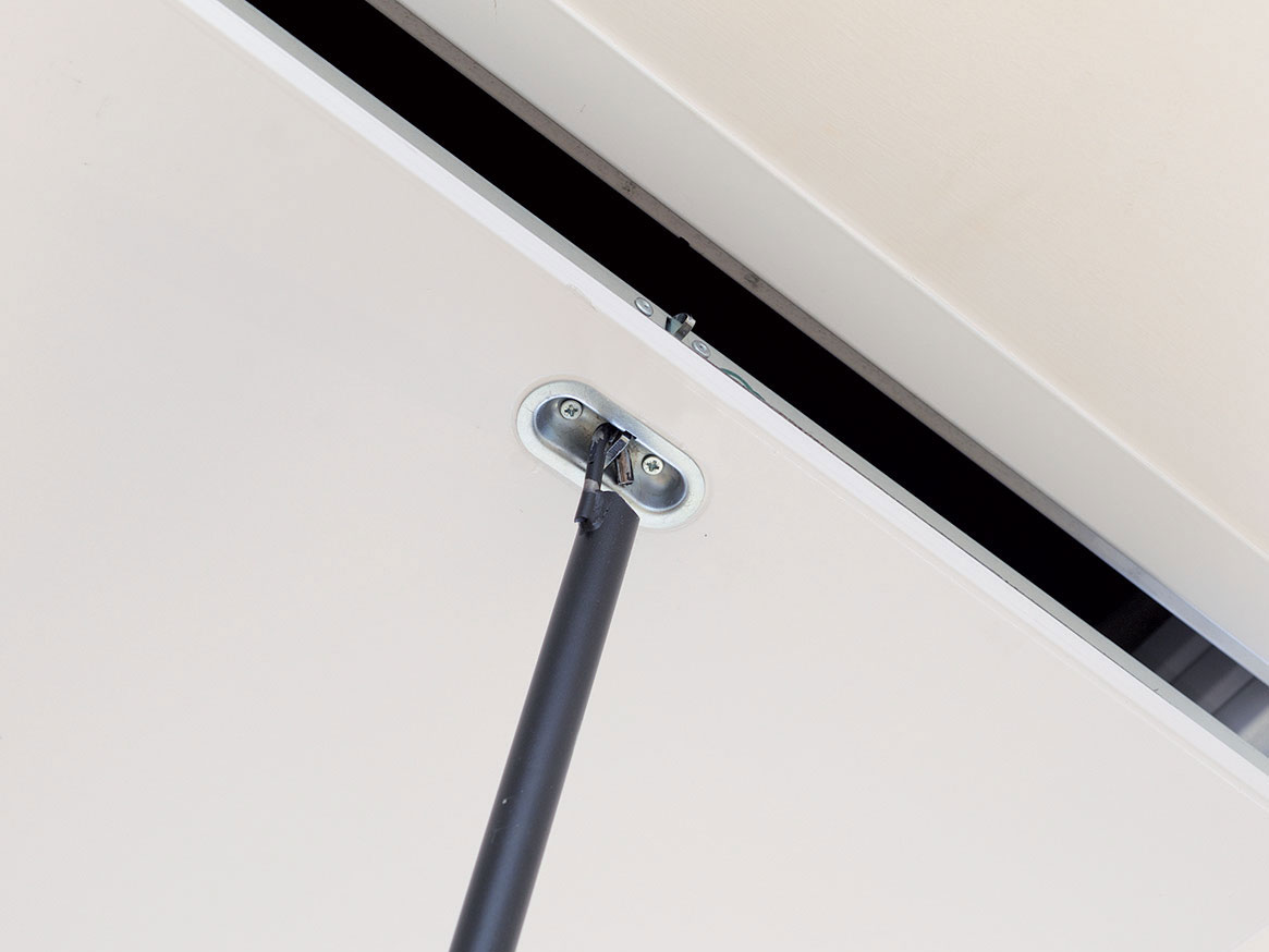 Pomocou háčika a sťahovacej tyče sa schody zložia tlakom od seba smerom k veku schodiska. Na druhom konci sťahovacej tyče sa nachádza plastová koncovka, ktorou sa veko úplne uzatvorí. Veko je z výroby z pohľadovej strany hladké a biele. Jeho povrch sa môže natrieť ľubovoľnou farbou.