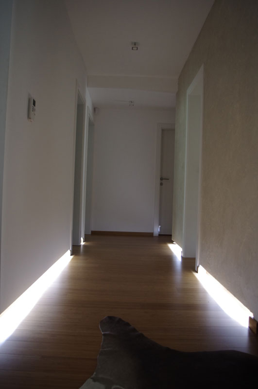 Intímne LED osvetlenie chodby zvýrazňuje originálnu podlahu a hlavne v noci nevtieravo naviguje v priestore.–>–>