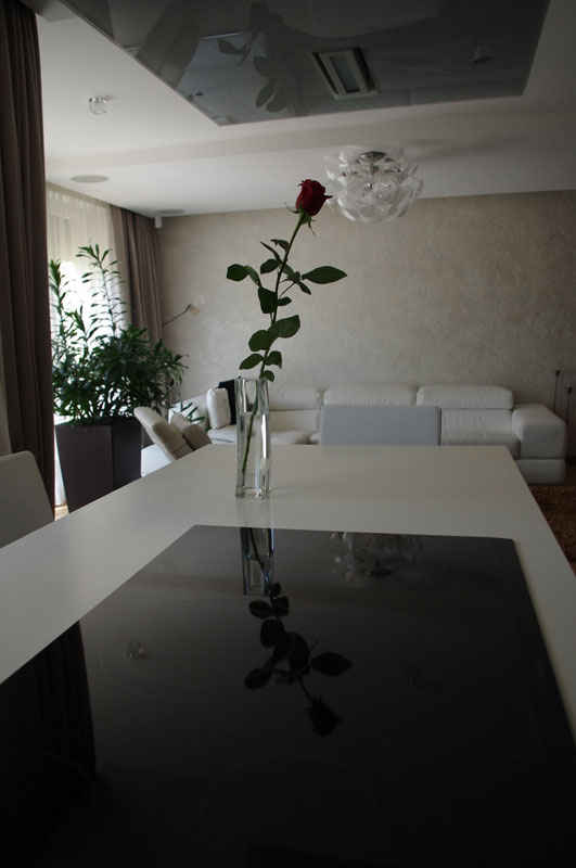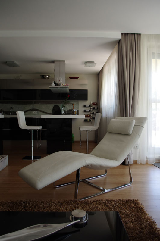 Cieľom bolo v najväčšej možnej miere dosiahnuť plynulý prechod z interiéru do exteriéru. Použité materiály, lesklé plochy a originálne povrchy stien sú odvážne, pretože ide o mladý pár. Návrh vhodne prepája byt s veľkou terasou a prakticky eliminuje polovicu chodieb.