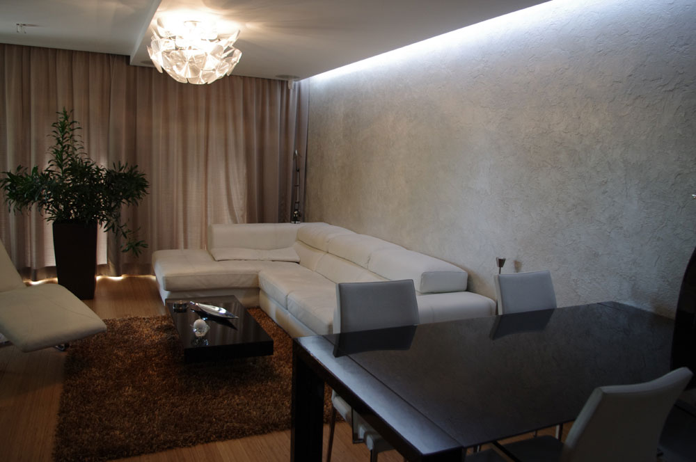 Obývacia izba s jedálenským kútom pôsobí útulne vďaka podhľadom s tlmeným LED podsvietením. Do podhľadu je prakticky zapustený záves so záclonou. Originalitu dodáva plastická stena z dielne ateliéru DM INTERIER.