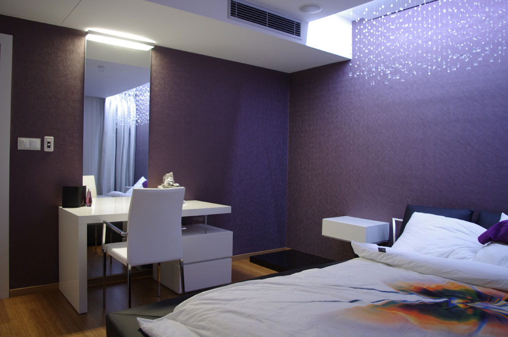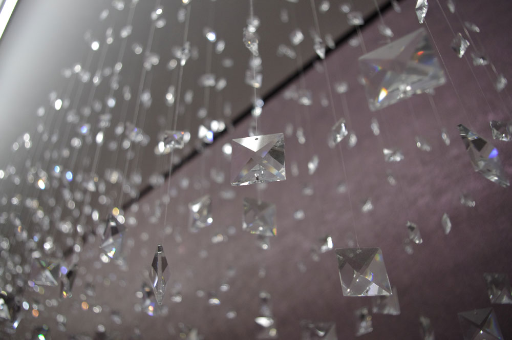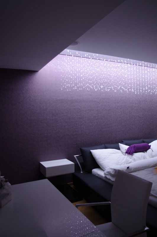 Nad priestorom postele je umiestnený „padajúci dážď“ z jemných kryštálov s tlmeným LED podsvietením takisto z dielne ateliéru DM INTERIER.