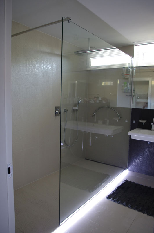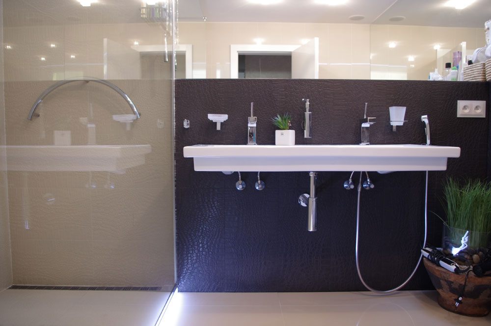 Bezrámový sprchovací kút na nasvietenom schodíku. Vďaka transparentnosti pôsobí vzdušne, necháva vyniknúť obklad s potlačou zvieracej kože. Kúpeľňa sa opticky zväčšila umiestnením veľkých zrkadlových plôch.