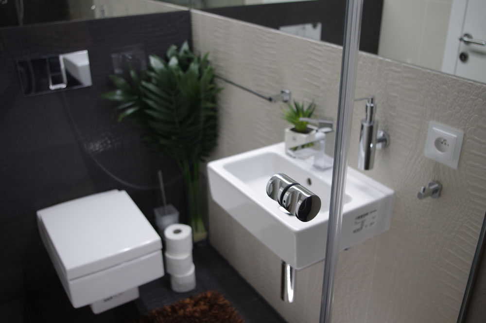 Rovnaké materiály sú použité v malej kúpeľni – tzv. hosťovskej. Vďaka transparentnému zaskleniu a zrkadlám pôsobí priestor ako väčší (pohľad zo sprchovacieho kúta).