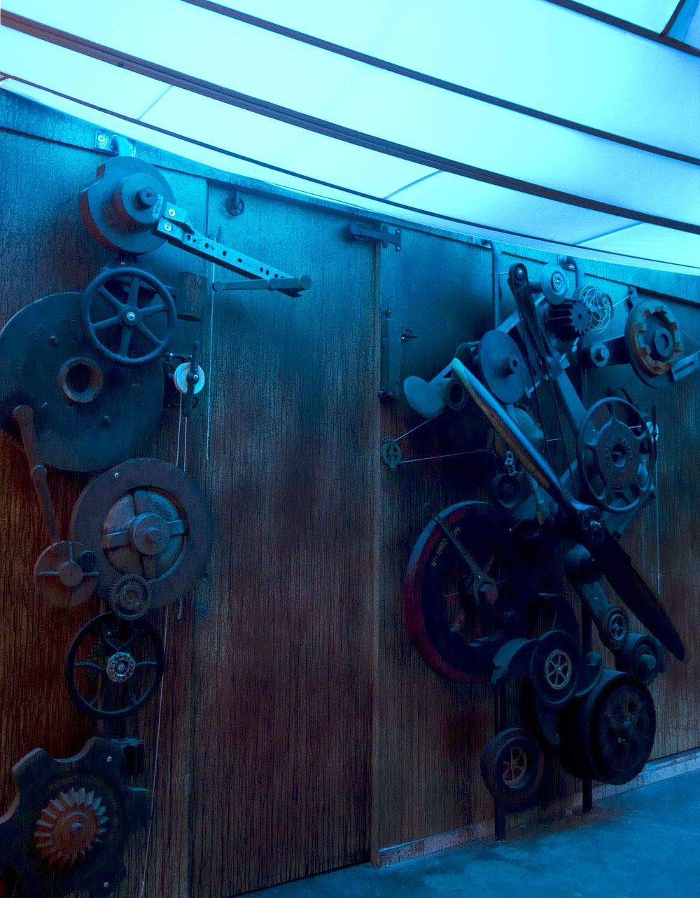 Industriálne súsošia umiestnené pri dverách, na stenách či na strope pochádzajú z dielne Iosifa Reziho z Quest Solutions. Okrem dekoratívnej funkcie slúžia aj ako podpery svietidiel či otváracie systémy dverí.