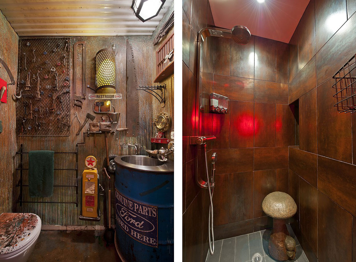 To sa však nedá povedať o druhej kúpeľni a toalete, pretože tie dokonale zapadajú do snového dizajnu zvyšku apartmánu. Kovové umývadlo s podstavcom z kovového suda, stena dekorovaná kovovými pracovnými nástrojmi či toaleta ozdobená neurčitým zhlukom hrdzavých odtieňov farby, stolček v tvare huby, steny obložené platňami pripomínajúcimi skorodovaný kov – toto všetko nájdeme v týchto dvoch originálnych miestnostiach.