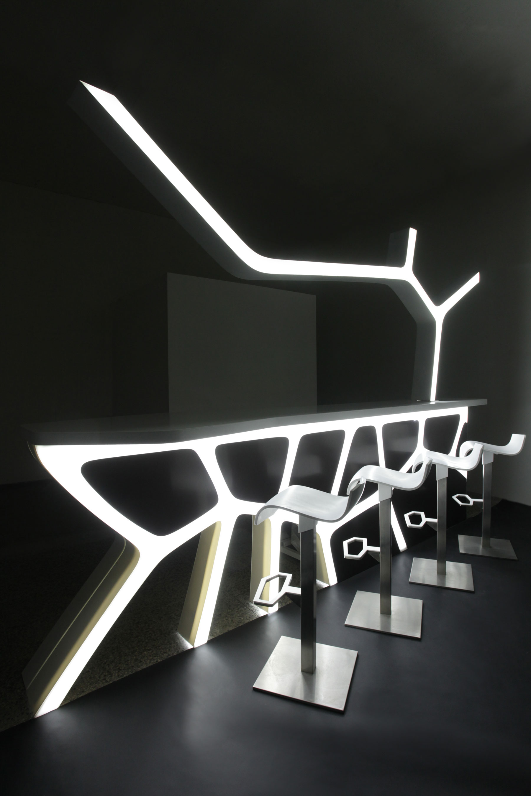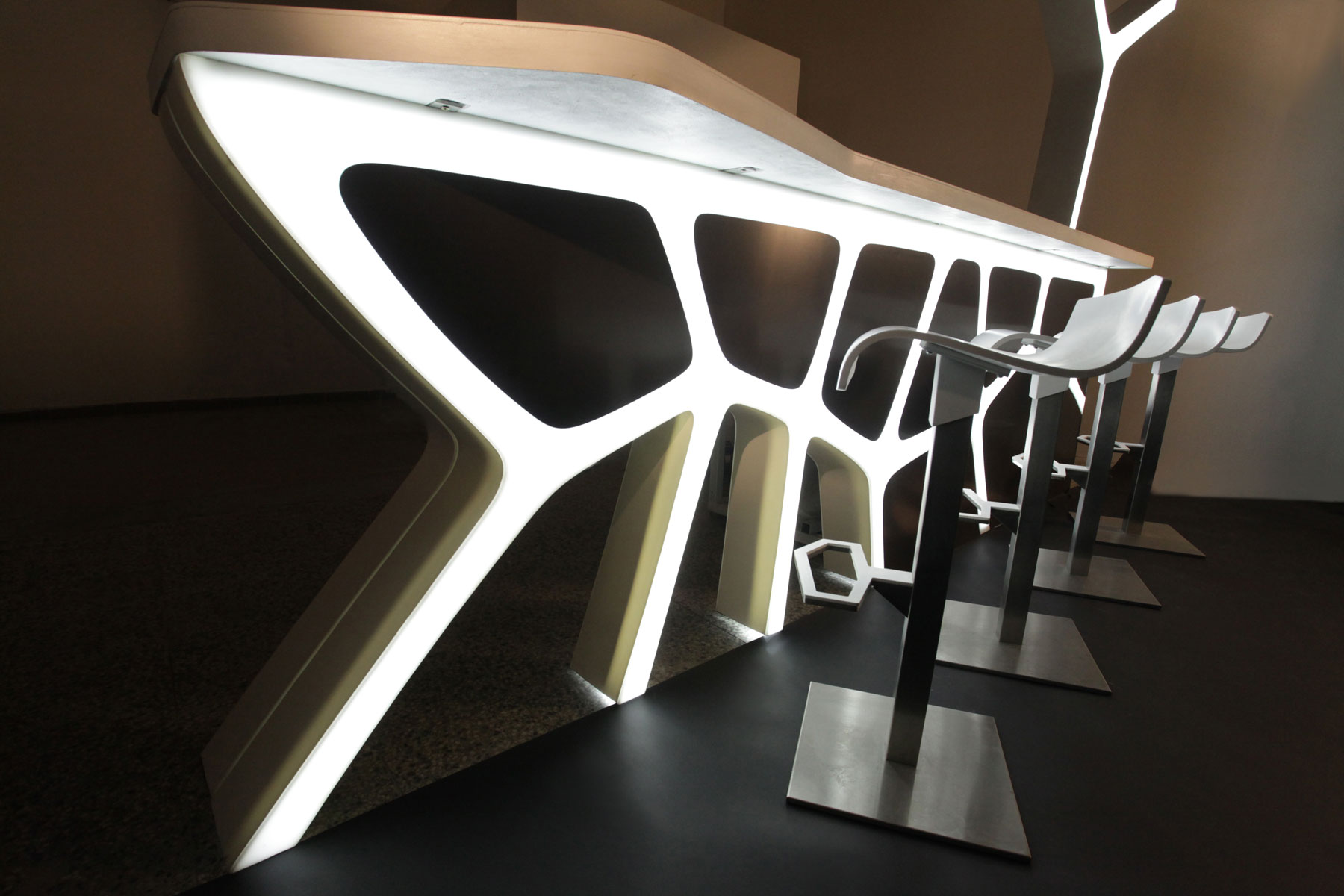 Konštrukcia barového pultu je kvôli pevnosti a odolnosti kovová. Ostatné časti baru sú vyrobené z prírodného akrylátového kameňa Hi-macs. Dizajn je od začiatku šitý na mieru technológii rezania vodným lúčom, keďže prezentácia vodného lúča, ktorý vlastní firma Kovovýroba Blecha, bola jedným z hlavných podnetov na tento projekt.