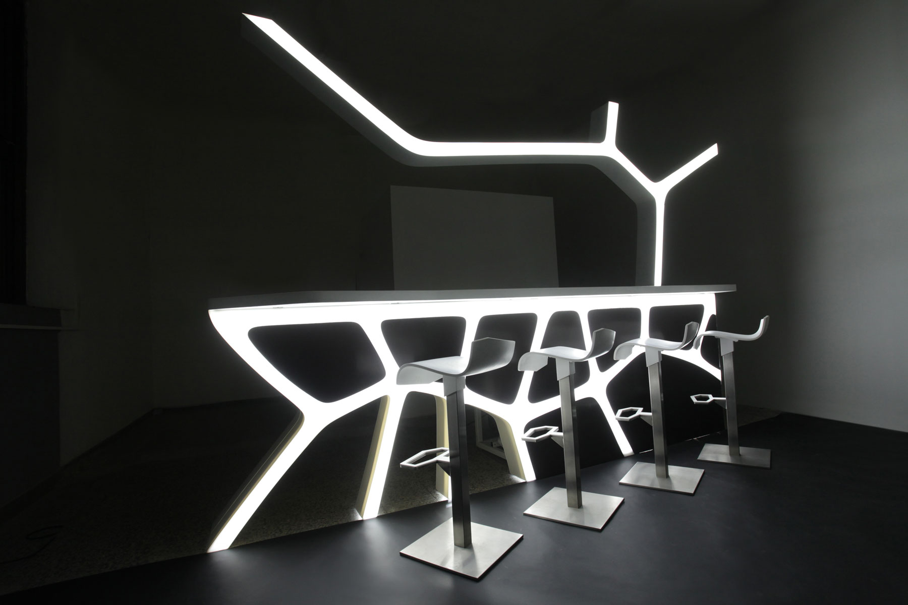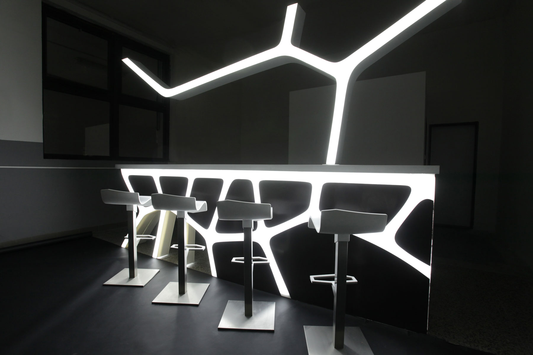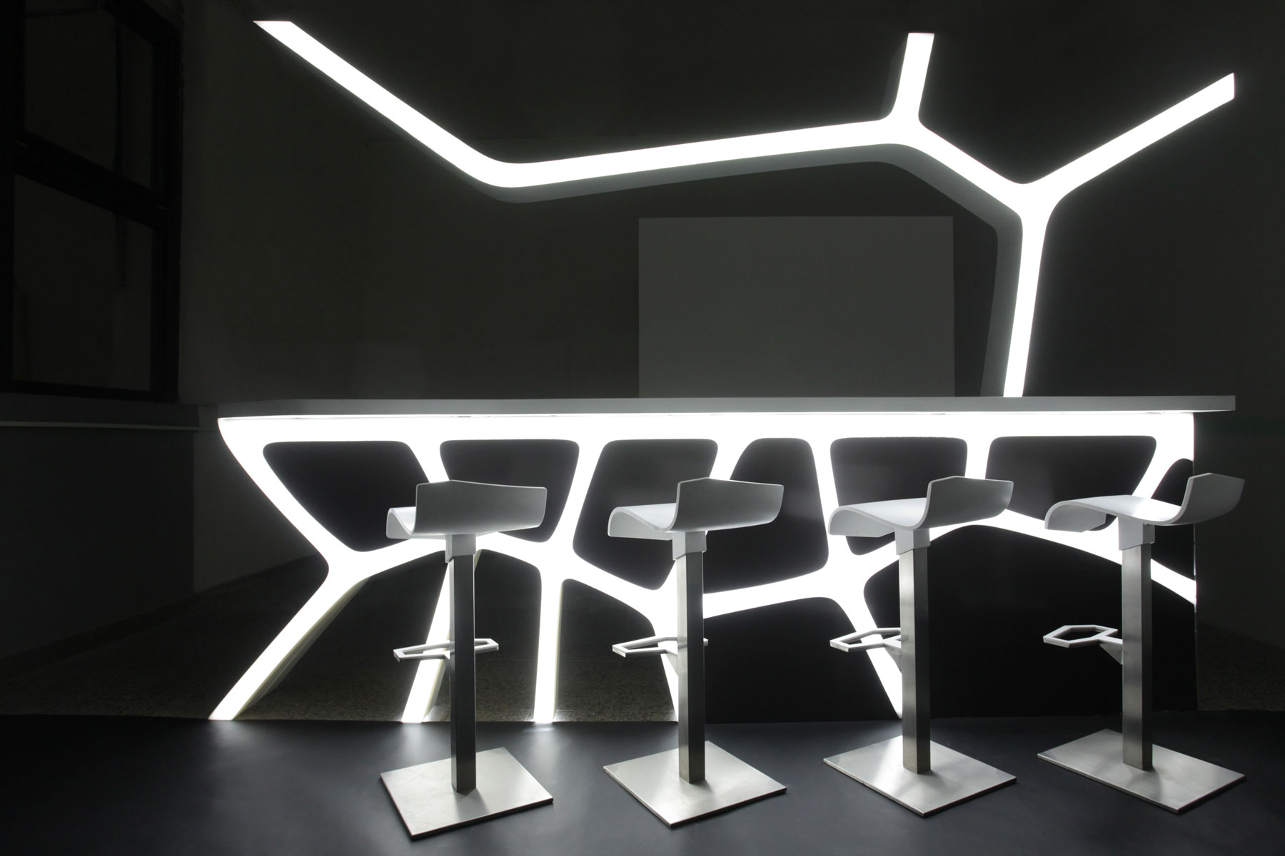 Pôvodným zadaním bolo niečo menšie, napríklad svietidlo. Nechýbala však chuť tvoriť, a tak sa z malého svietidla postupne stalo svietidlo s barovou stoličkou a nakoniec takmer 4-metrový podsvietený barový pult s ôsmimi stoličkami a dvoma barovými stolíkmi …