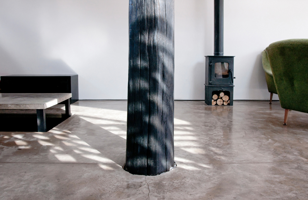 Veľké rohové okno na prvom podlaží orientované na juh prináša dostatok svetla a tepla, ktoré preniká ďalej do domu – priamo do jeho srdca. Svetlo diagonálne klesá na betónovú podlahu.