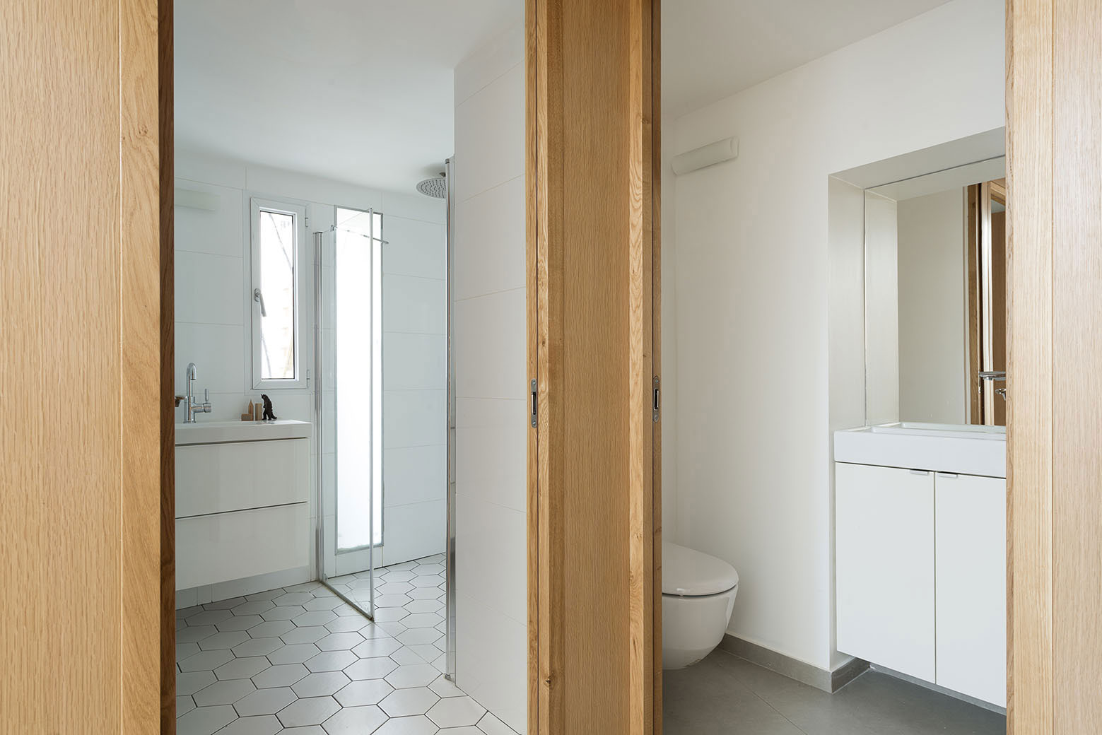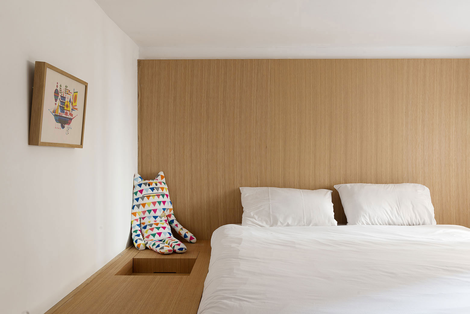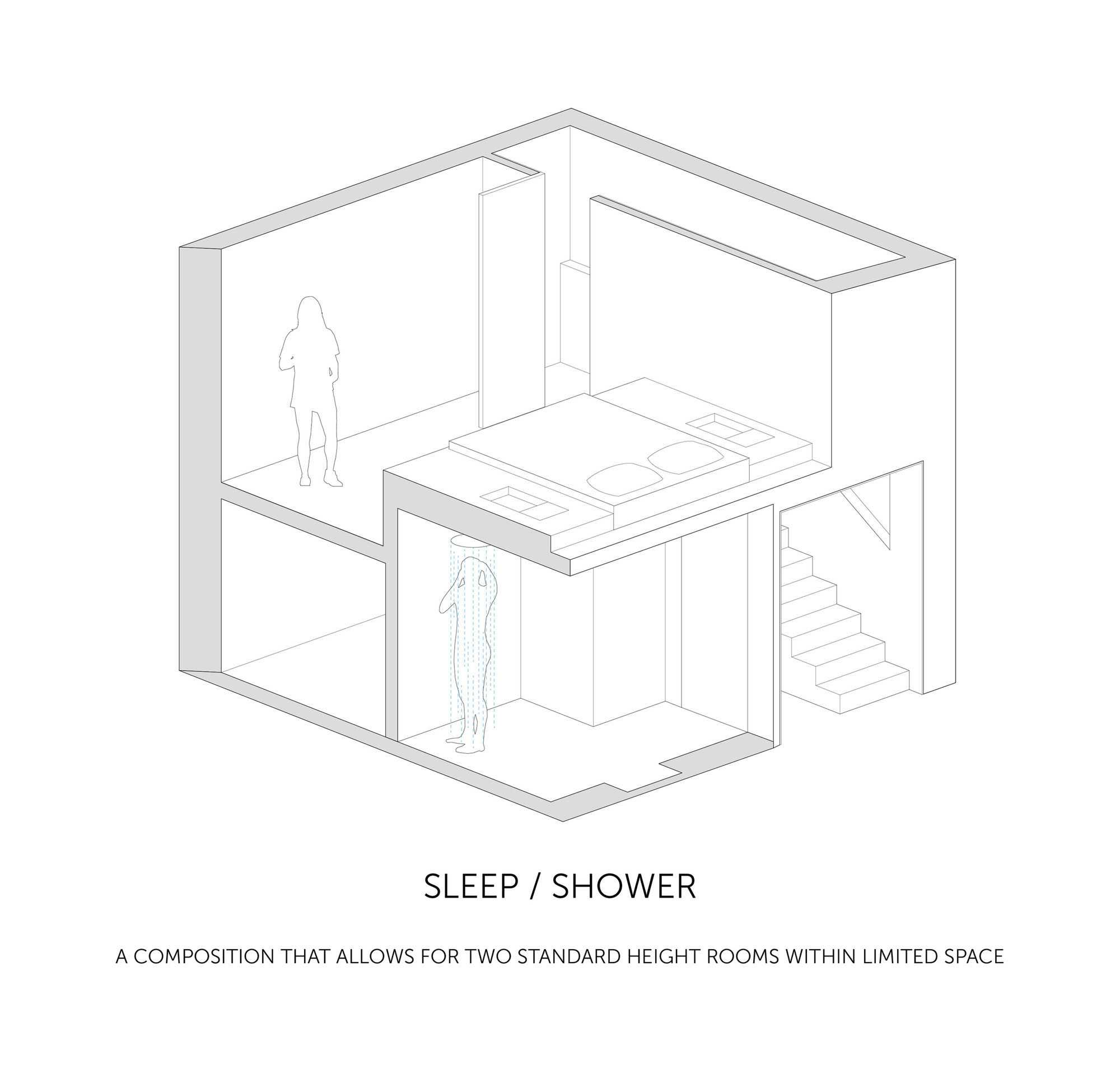 Východiskovým bodom bolo riešenie nadzemnej spálne a kúpeľne, ktorá sa nachádza pod ňou na prízemí. Na nákrese, ktorý odhaľuje vnútorné usporiadanie miestností, môžeme vidieť šikovné riešenie, vďaka ktorému sa podarilo rozmiestniť všetky súčasti interiéru tak, aby boli funkčné a aby bol každý štvorcový meter efektívne využitý. Zvýšený strop nad kúpeľňou tvorí základ pre posteľ, ktorá je v podstate umiestnená na podlahe, no zároveň je vo výške klasickej postele.
