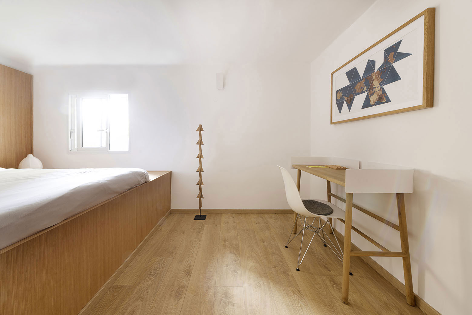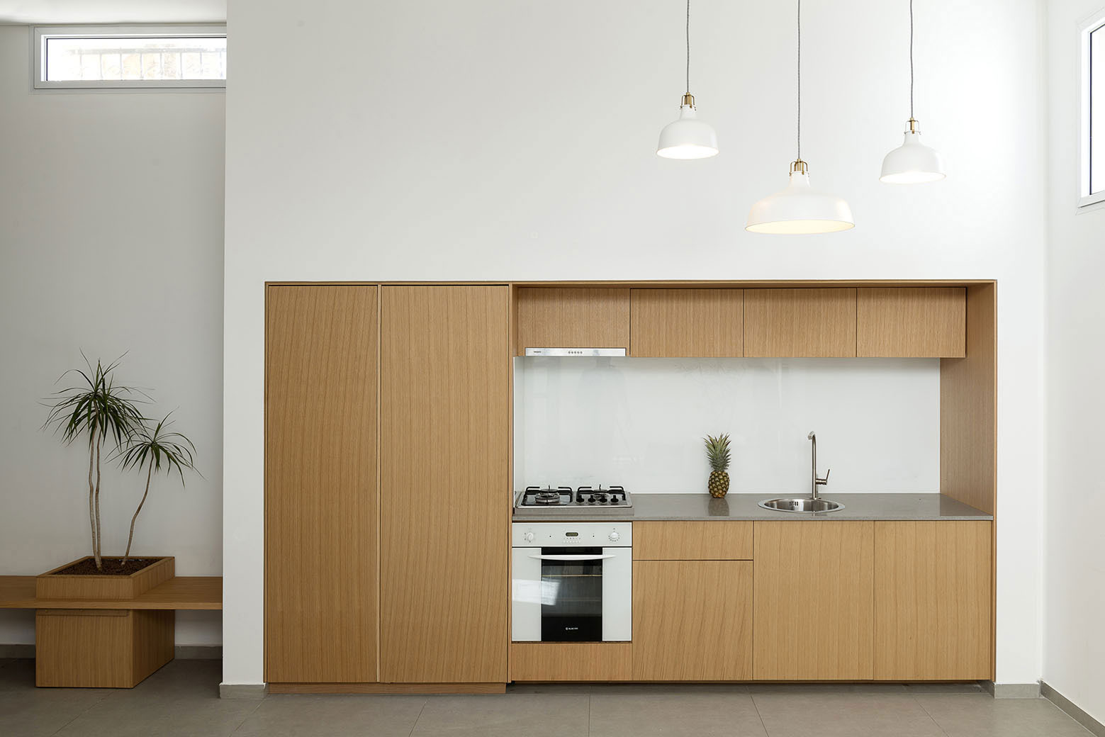 Apartmán je zariadený jednoducho, prevláda v ňom biela farba a drevo doplnené sivými odtieňmi v obývacej časti a modrými odtieňmi okolo schodiska v priestoroch kúpeľne. Využitie svetlých drevných odtieňov, bielej farby a čistých línií je pre architekta Itai Palti typické. Zariadenie je jednoduché a účelné. Interiér oživuje palma v kvetináči a vonkajší dvor zdobí citrónovník, ktorý odkazuje na tradičné pestovanie citrónovníkov v danej oblasti.