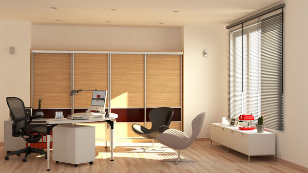 Na pracovisku by ste sa mali obklopovať predovšetkým prírodnými materiálmi, preto je kancelárska stena v drevodekorovej úprave vhodnou voľbou. V moderných kancelárskych priestoroch sa však ako výplň dverí vstavanej skrine uplatnia aj drevotrieska v zaujímavej farbe, lacobel, prípadne kombinácia drevotriesky a skla. Opatrne treba zaobchádzať najmä s množstvom kovu, ktorý priestor ochladzuje. Rozhodnutie zvoliť si do kancelárie kancelársku stenu, však podporuje najmä systém jej otvárania. Posúvaním dverí po koľajničkách sa šetrí miesto a ľahký, nehlučný posuvný systém zabezpečený proti vyskakovaniu umožňuje jednoduché otváranie skrine.