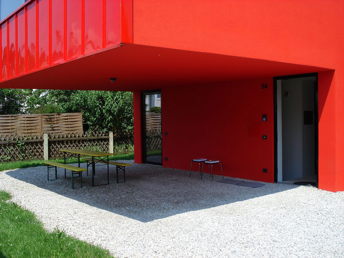 Podľa autorov je to „veľký dom postavený na malom pozemku a pri ešte menšom rozpočte“. Plášť budovy je výrazne viditeľný už z diaľky – tvorí ho totiž súvislá vrstva krvavočervenej farby, ktorá je prerušená iba presklenými časťami s čiernym rámom. K domu vedie štrková cestička, pričom štrková vrstva tvorí aj chodníček okolo domu a zároveň podklad pre parkovacie miesto, ktoré je nadstrešené samotnou stavbou.