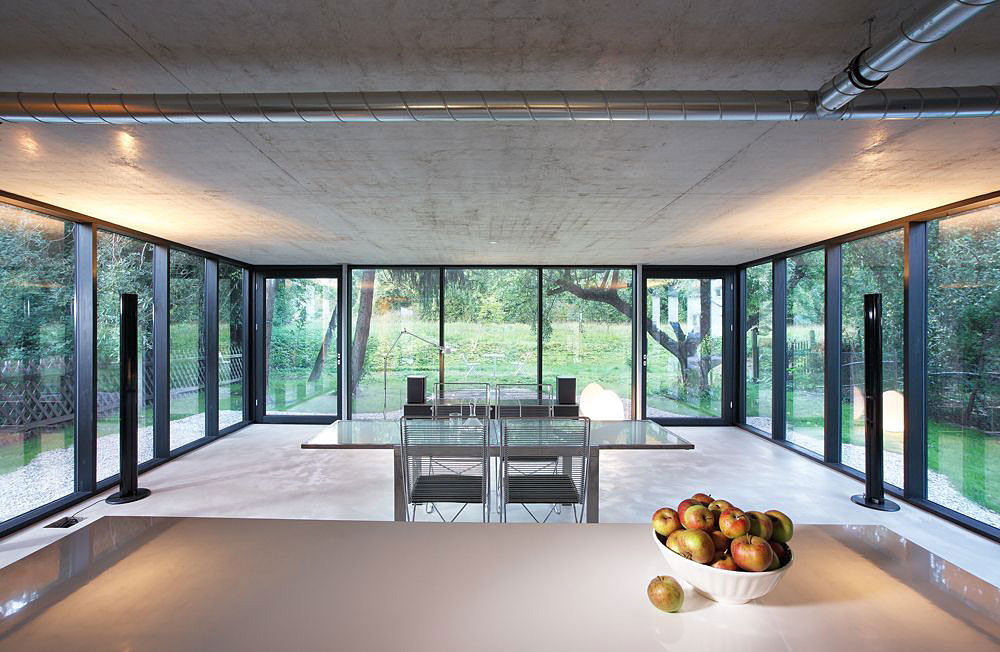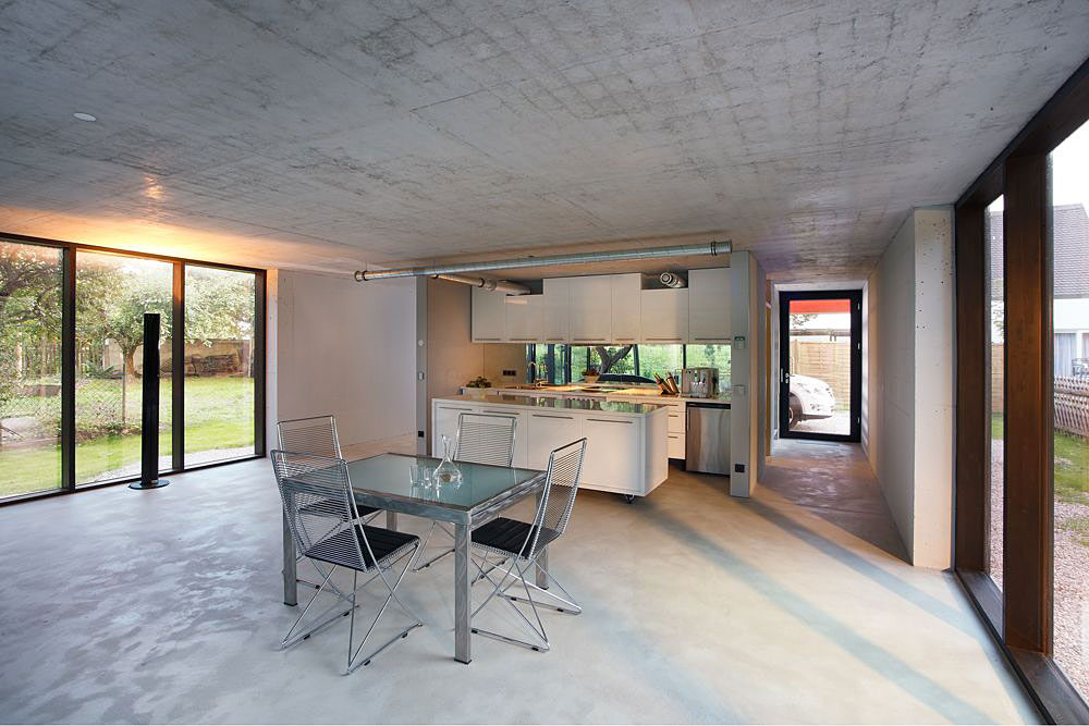 Dom s dĺžkou 16 metrov sa rozpína v orientácii sever – juh. Pod spálňovou časťou s terasou a pracovňou nájdeme na prízemí spoločenský priestor, ktorý tvorí obývacia izba, jedáleň a kuchyňa. Okrem toho sa tu nachádza schodisko, kúpeľňa a vstup do pivnice. Priestor je v rámci obývacej časti z troch strán zasklený s výhľadom na stromami zaplnenú severnú časť pozemku (rovnaký výhľad ako z terasy). V Nemecku veľmi netradičná orientácia hlavných výhľadov z domu na sever bola populárna medzi anglickými aristokratmi 19. storočia.