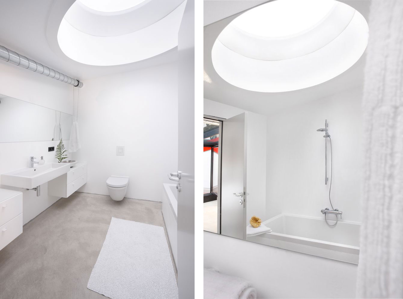 Keďže nadzemná časť slúži ako intímno-pracovná zóna, okrem priestrannej pohodlnej spálne tu nájdeme ešte kúpeľňu s toaletou. Kúpeľňa je zariadená minimalisticky, čisto a účelne. Prevláda v nej biela farba, ktorá je podporená priamym denným svetlom zo strešného svetlíka v kruhovom tvare. Spálňa je takisto zariadená prevažne v bielych a bledosivých odtieňoch s kontrastnými červenými akcentmi – napríklad v podobe dizajnových stoličiek.