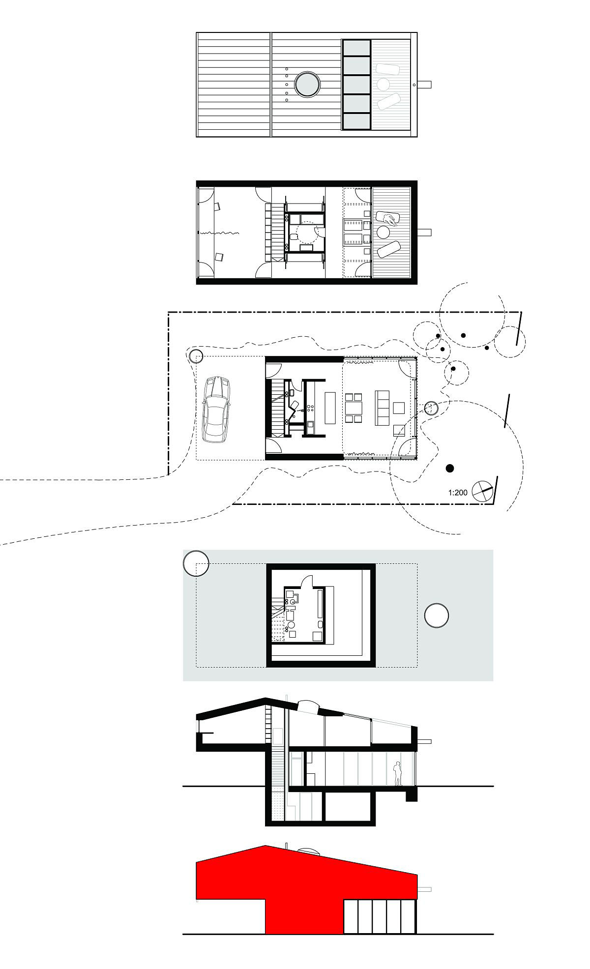 Parkovacie miesto môže zároveň šikovne slúžiť v letných mesiacoch ako nadkrytá prízemná terasa. Výbežok domu, ktorý toto miesto chráni, ponúka ďalšiu priestrannú, tentokrát nadzemnú terasu, ktorá je priamo prepojená s loftovým priestorom. Stena, ktorá oddeľuje a zároveň spája terasu s loftom, je tvorená sklenými panelmi v čiernych kovových rámoch. Aj istá časť strechy v tomto priestore je zasklená. Vďaka tomu je možné pozorovať hviezdnaté nebo či uspávajúci dážď priamo z postele, ktorá sa nachádza práve v tejto časti domu.