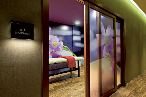 Na navodenie nálady použili dizajnéri aj veľkoplošné fotografické tapety so zväčšenými prírodnými motívmi a vodoodolnou povrchovou vrstvou. V masážach vytvárajú atmosféru podľa jednotlivých druhov poskytovaných služieb, napríklad thajská masáž alebo klasická. Motív sa opakuje aj na vstupných posuvných sklenených dverách, čím autori dosiahli aj intimitu priestoru. V chodbe, ktorá vedie od šatní a spŕch, autori tiež použili na jednej stene veľkoplošnú tapetu. Chodba je však úzka a obraz by ostal pohľadom neobsiahnuteľný. Riešením je vtip v podobe posuvných zrkadlových dverí pred úložným priestorom na protiľahlej stene.