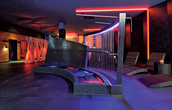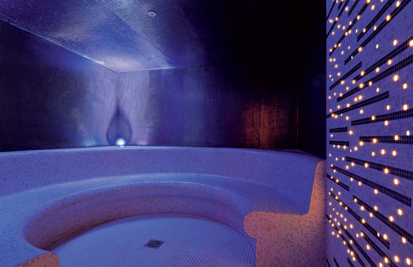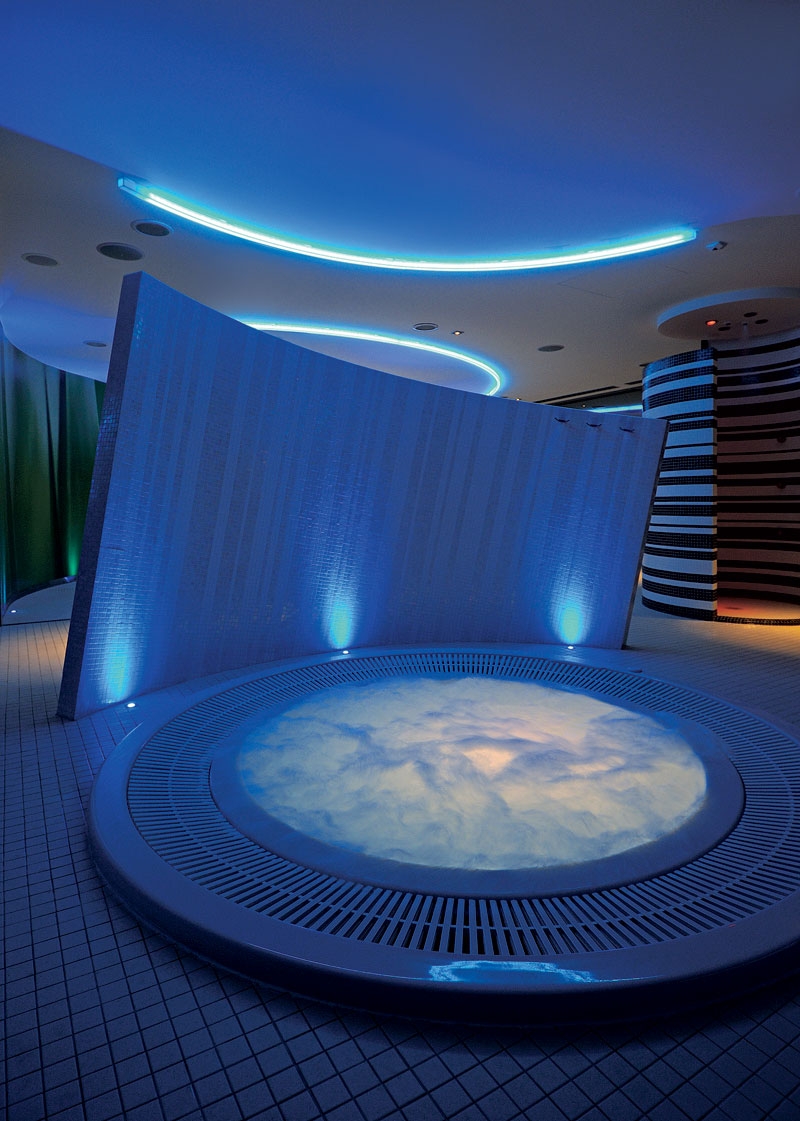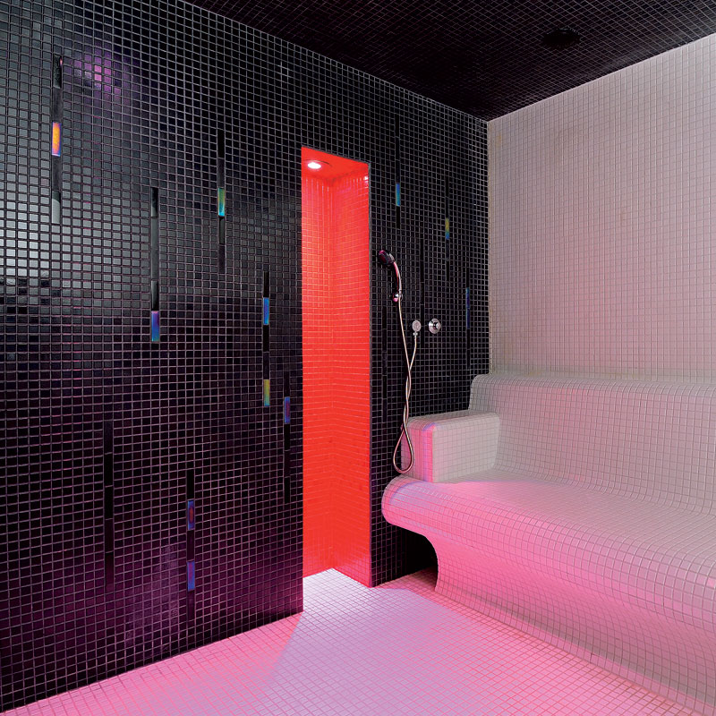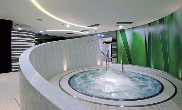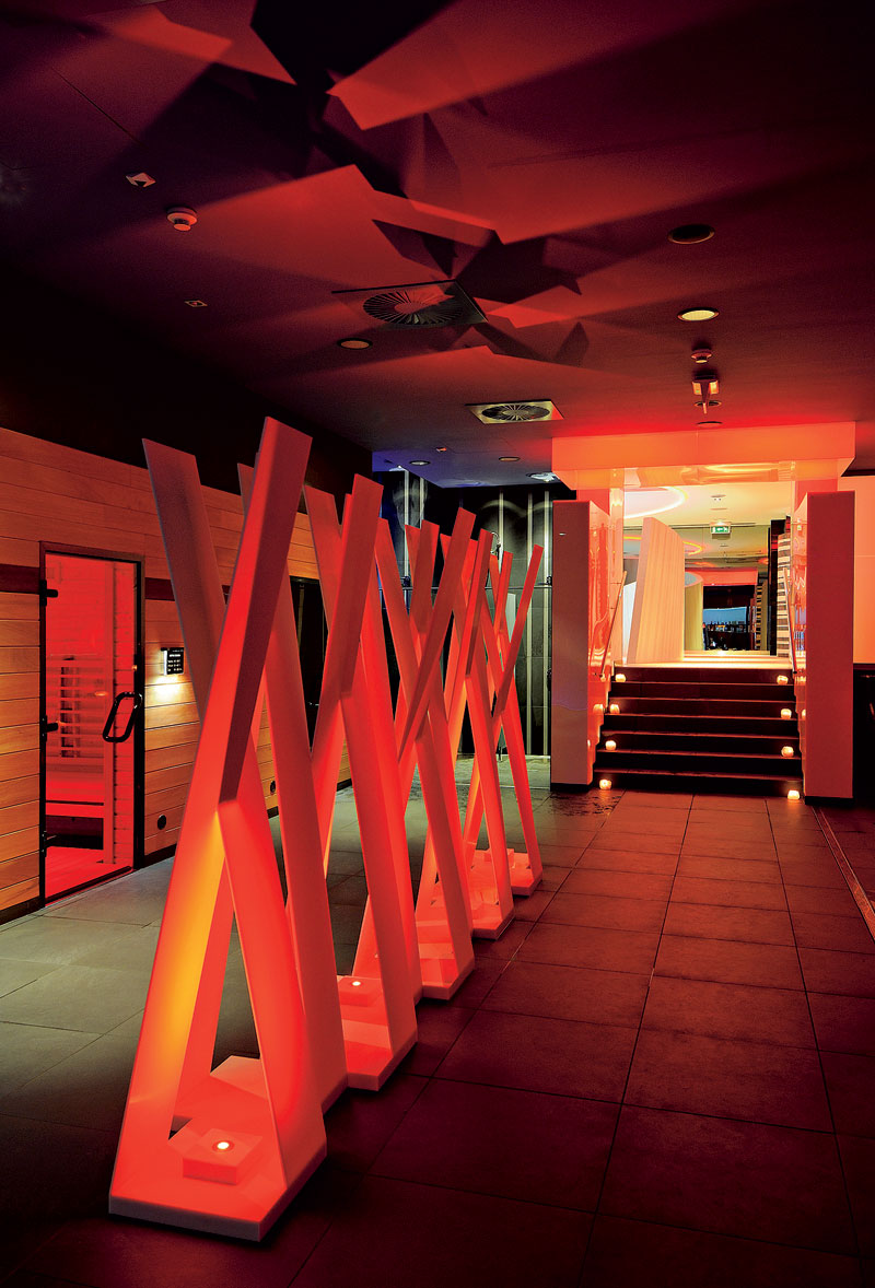 „Našou úlohou bolo navrhnúť wellness centrum do univerzálneho chladného betónového priestoru, ktorý mal len lamelový strop a bielu dlažbu na podlahe. Nebol práve najvhodnejší na budúce wellness. Bolo nutné vymyslieť logistiku prevádzky, spevniť nosné konštrukcie podláh a vybudovať všetky rozvody,“ priblížil mi východiskovú pozíciu Doc. Mgr. Miroslav Debnár a dodal: „Aby sme mohli vybudovať aj vírivky zapustené do podlahy, museli sme v jednej časti zdvihnúť jej úroveň o 1,2 m a do medzipriestoru sme umiestnili vyrovnávacie nádrže a technológie. To pomohlo vytvoriť samostatnú časť čiastočne oddelenú od hlavného priestoru a pomocou oblúkových stien zabezpečiť intimitu vo vírivkách. Celá dispozícia relaxačného komlexu pozostáva zo vstupnej haly, v ktorej je recepcia a bar. Prechodom cez turnikety sa vstupuje do šatní s hygienickým zázemím a zároveň do bloku, v ktorom sú masáže. V hlavnom wellness priestore je zóna tepidária so saunami a vírivými bazénmi.“