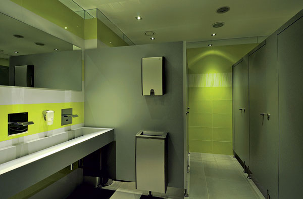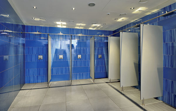 Šatne a hygienické priestory sú farebne oddelené. Ženské sa nesú vo sviežej zelenej a mužské vo svetlomodrej kombinácii s bielymi pásmi.