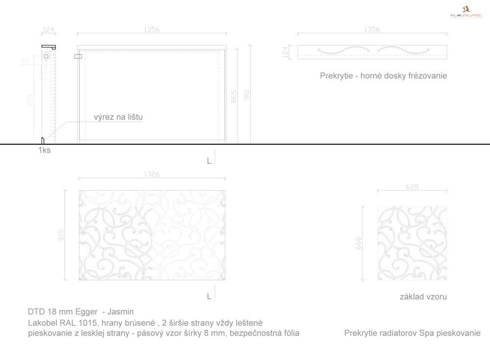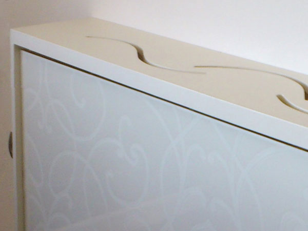 Detail prekrytia radiátora. Nápad na estetický detail vznikol inšpiráciou textúry na tapetách, ktoré sa v rodinnom dome nachádzajú na vyššom podlaží. Prekrytie je vyhotovené z dosiek Egger – jasmín s výplňou z lakobelu (DOMO GLASS). Vyrobilo Stolárstvo Pavol Kupec.