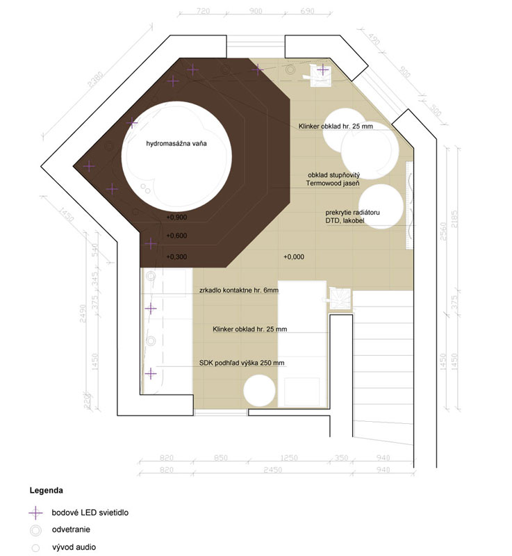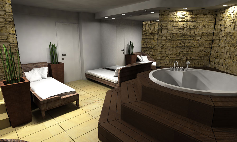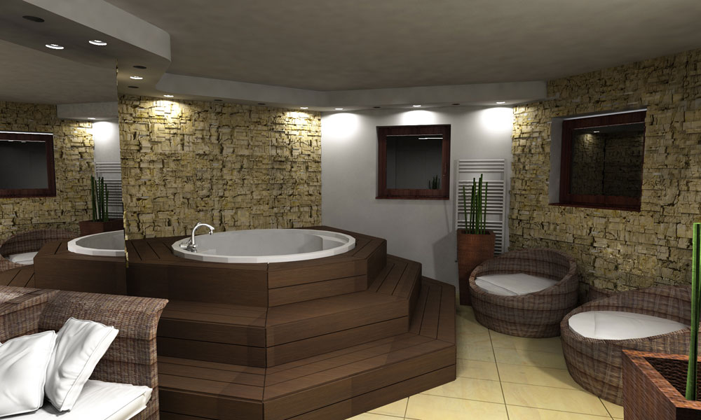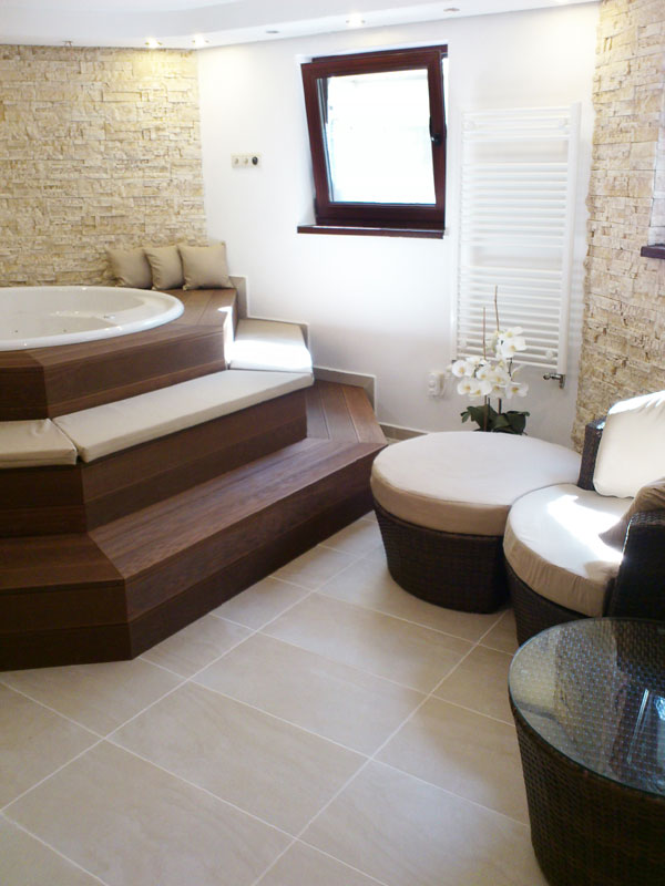 Hydromasážna vaňa v sebe ukrýva chromoterapiu. Svojou vyvýšenou pozíciou dominuje priestoru. Bola vytvorená z tvaroviek a obložená moreným jaseňom (Termowood – jaseň, moridlo – olej Tikurilla).