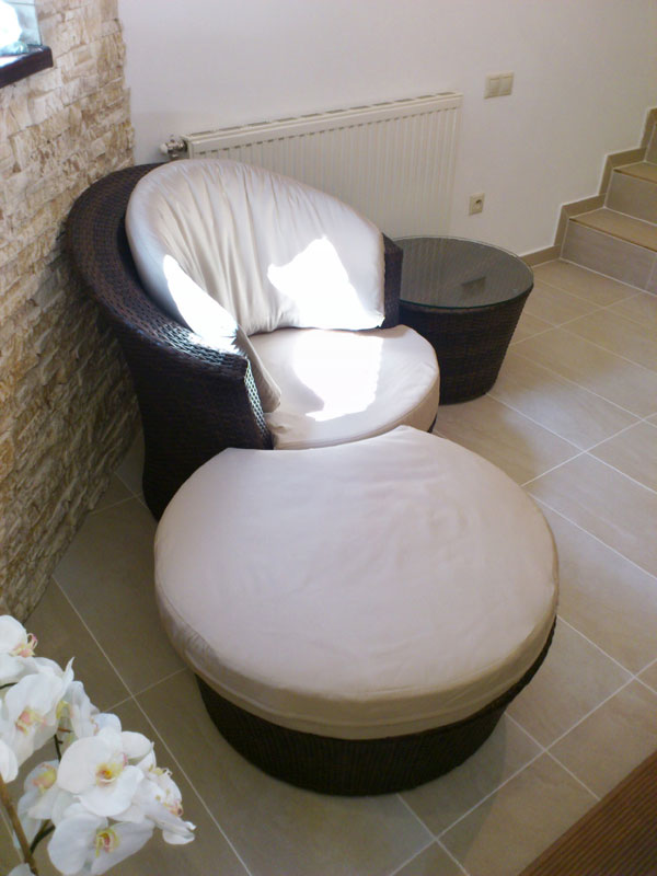 Nábytok v oddychových zónach. Ratanové kreslo s podložkou, polohovateľné ležadlá so stolíkmi i kvetináče značky Topratan. Dvere sú od talianskej firmy Bertoloto.