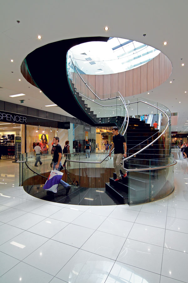 „Skladba obchodov? To je celá veda. Architekt však v tomto prípade veľa nezmôže, hlavné slovo má investor. Len ak apeluje veľmi dôrazne, podarí sa mu možno niečo ovplyvniť,“ konštatuje Branislav Kaliský. Nevyhýba sa ani téme povestného „ťahania“ návštevníka po celom centre: „Už len určovanie smeru chodu eskalátorov je výsledkom analýzy odborníkov. Je to v podstate interiérový urbanizmus. S tým však nevieme my, architekti spraviť vôbec nič. Mňa to napríklad tiež z pohľadu užívateľa veľmi vyrušuje a nestotožňujem sa s tým. Investor však má svoje prieskumy, ktoré dokazujú, že ak človeka prevediete celým nákupným centrom, obchodný efekt sa zlepší.“ A to je, samozrejme, podstatné. „Na druhej strane však je faktom aj to, že ak je prechod z bodu A do bodu B príliš komplikovaný, návštevníkovi sa môže ľahko stať, že počas presunu aj zabudne, kam sa pôvodne chcel ísť pozrieť,“ konštatuje Igor Mazúch.