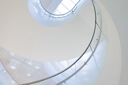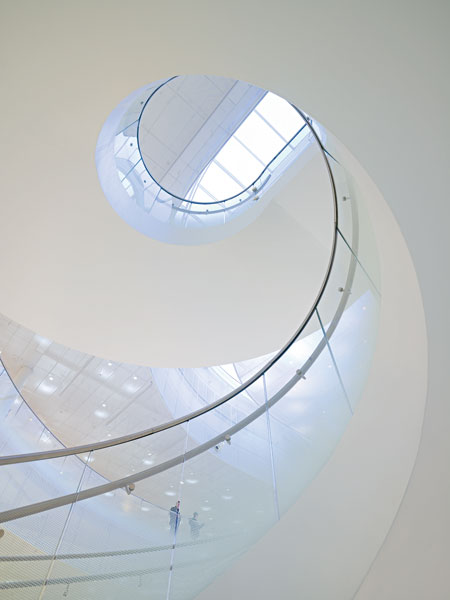 V lesklom, no decentnejšom štýle je interiér budovy. Aj tu sa opakuje polopriehľadný materiál – prevažuje sklo, svetlý dekór, doplnky z nehrdzavejúcej ocele. Zavesený strop prepúšťa rozptýlené svetlo. Balustráda schodiska so zábradlím, vytvoreným z jemnej siete, pôsobí takmer étericky. Priestor sa otvára do druhého podlažia v jadre budovy, ktoré nie je presne v strede, a prepúšťa lúče svetlíkom nepravidelného tvaru, pripomínajúcim oko.